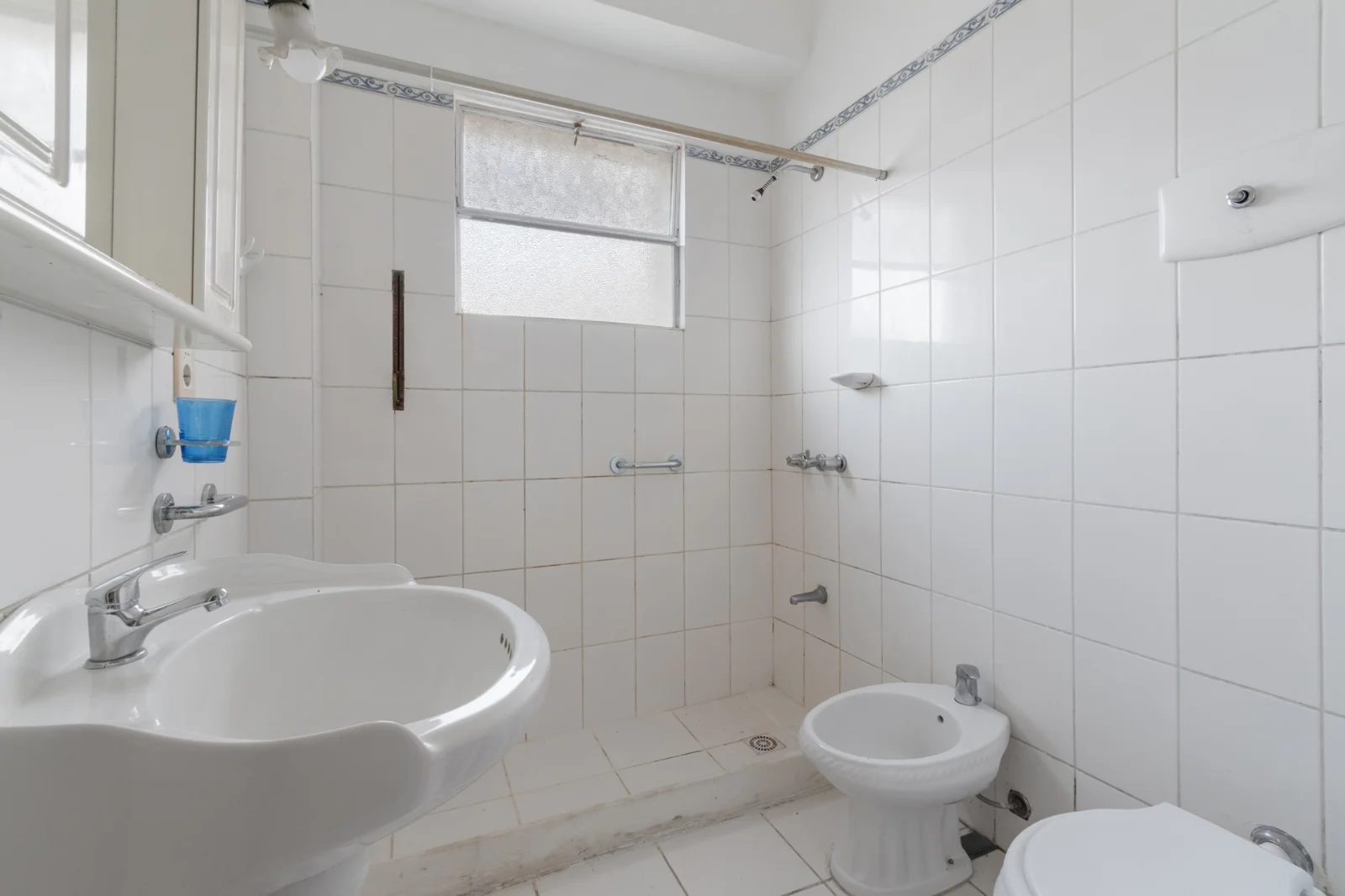 Baño completo, con ventilación natural. Ducha sin mampara. Revestimiento cerámico blanco en pisos y paredes. Grifería funcional, sanitario y lavamanos en loza tradicional.