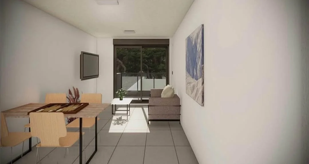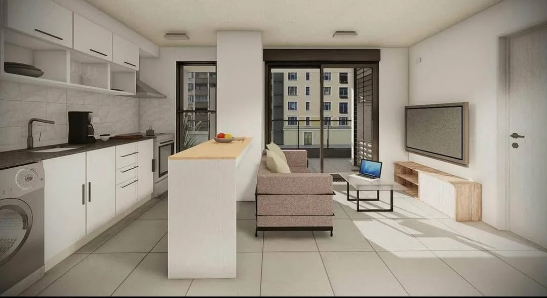 Distribución: El apartamento cuenta con una distribución funcional que integra un amplio estar-comedor y cocina.