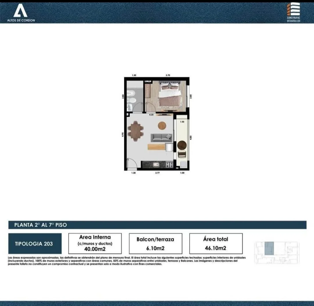 Superficie: El área interna es de 40 m², con un balcón/terraza de 6.10 m², sumando un área total de 46.10 m².