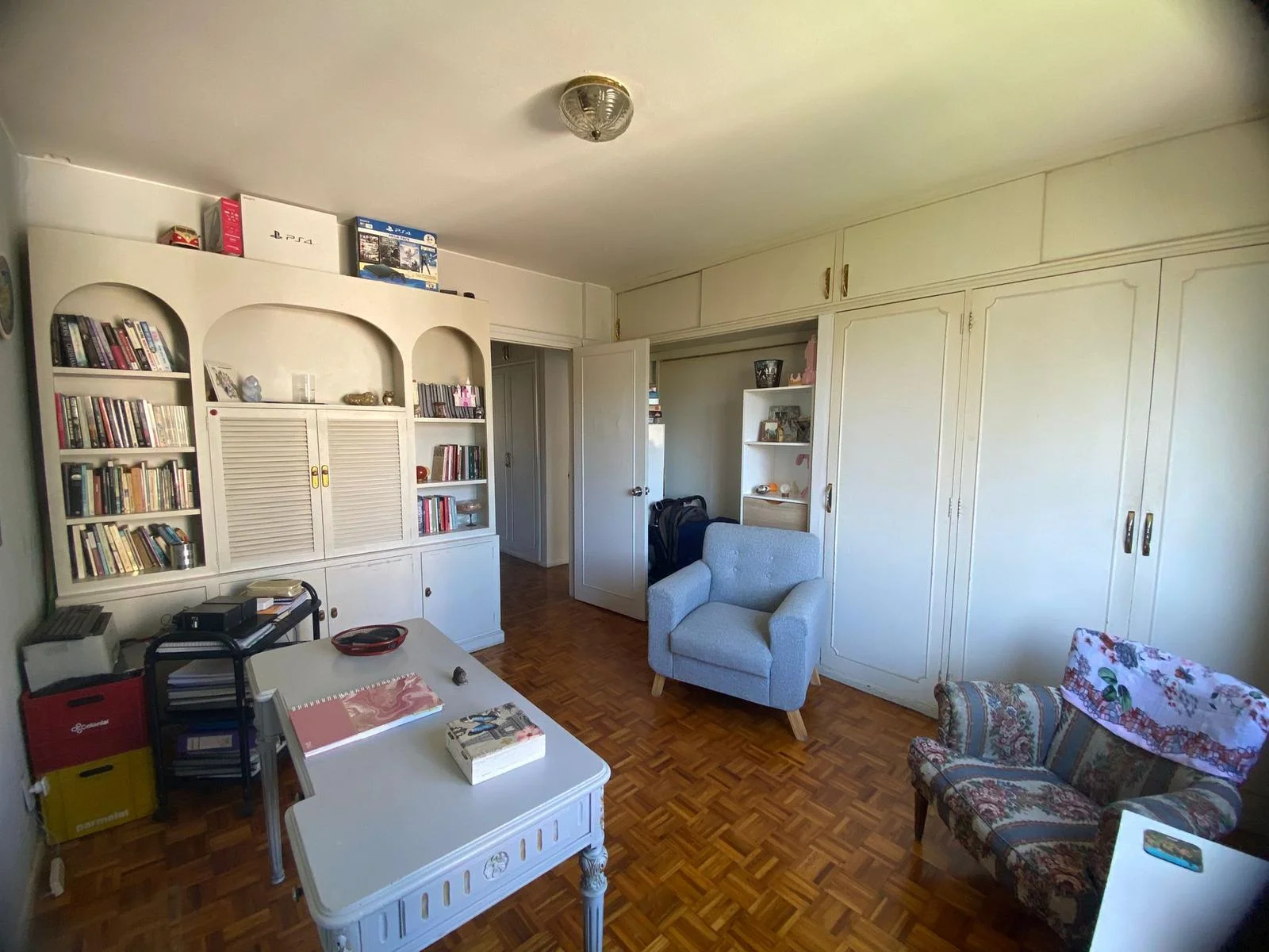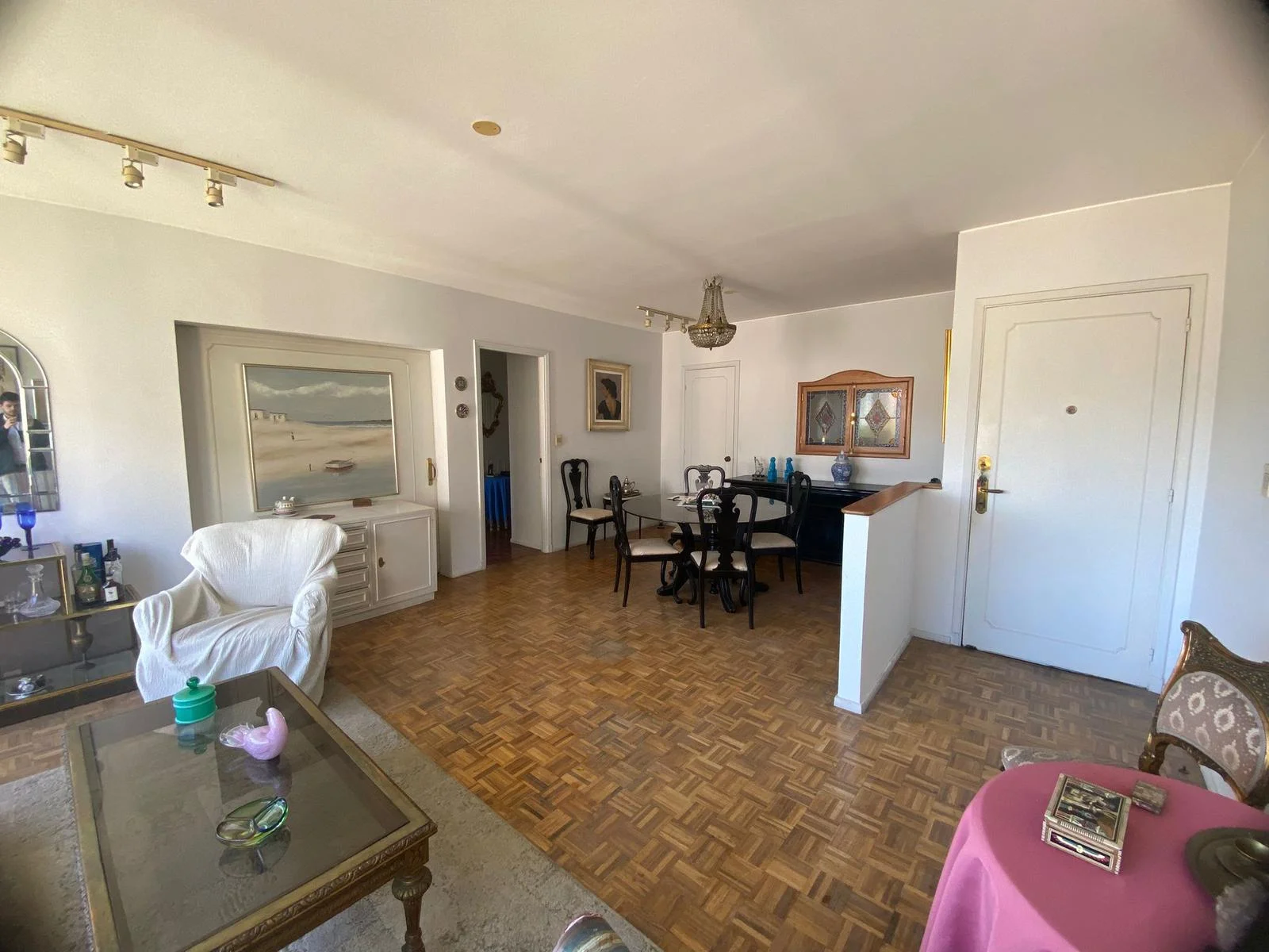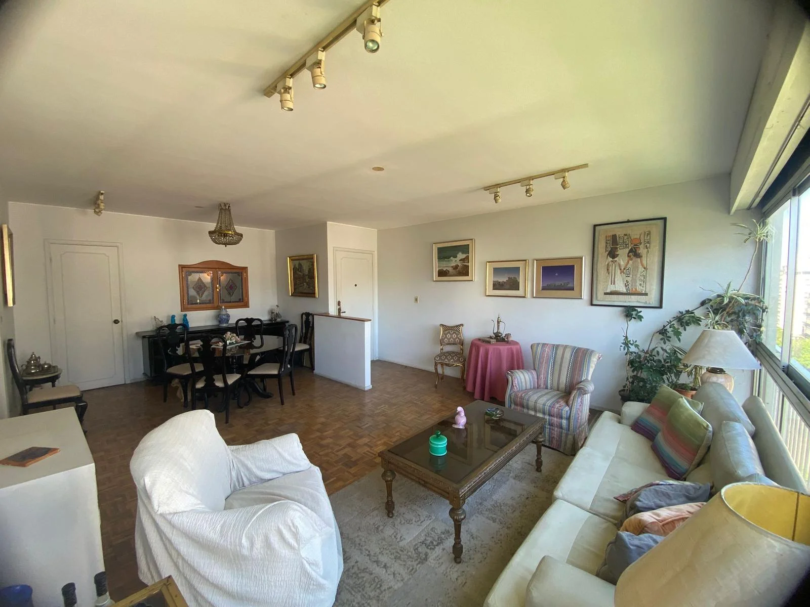 Amplio y luminoso living comedor, cómodo con ventanales y con pisos de parquet.