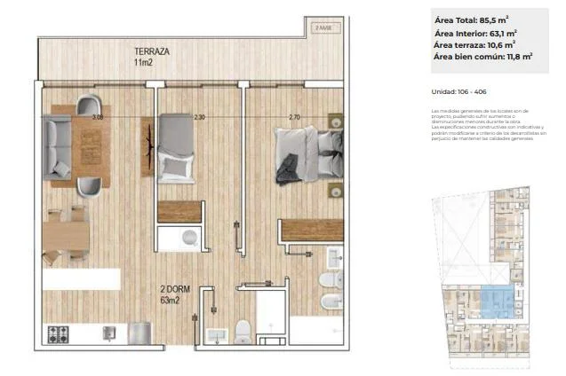 Primero piso al contrafrente, con orientación Este. Apartamento con living comedor con salida a amplia terraza, cocina semi definida, dos dormitorios, el principal en suite y ambos con salida a la terraza. Baño social completo.