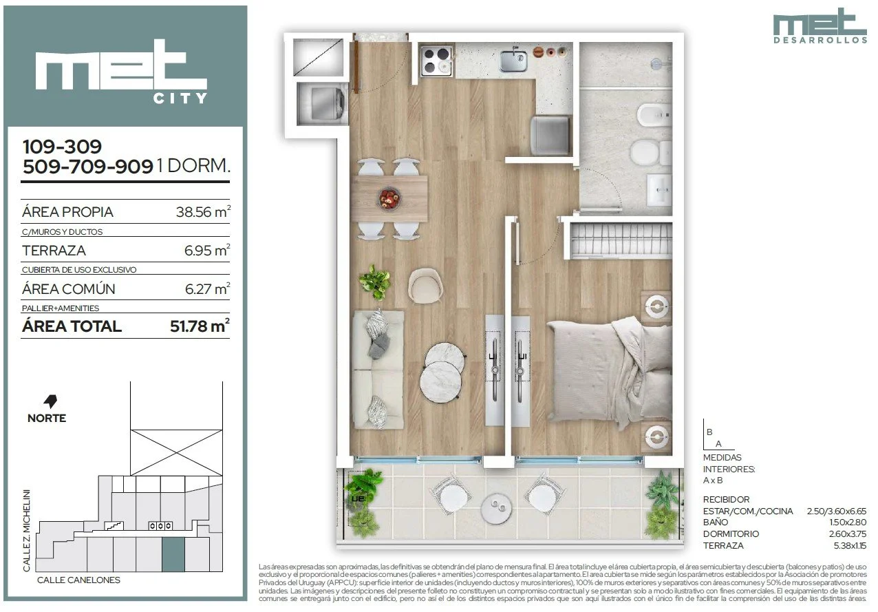 Venta de apartamento de 1 dormitorio en Met City, Centro, ubicado en Canelones, entre Héctor Gutiérrez Ruiz y Zelmar Michelini, en una zona hiperconectada, donde te facilita la logística cotidiana, con todos los servicios a mano y a su vez muy cerca del escape de la Rambla.
