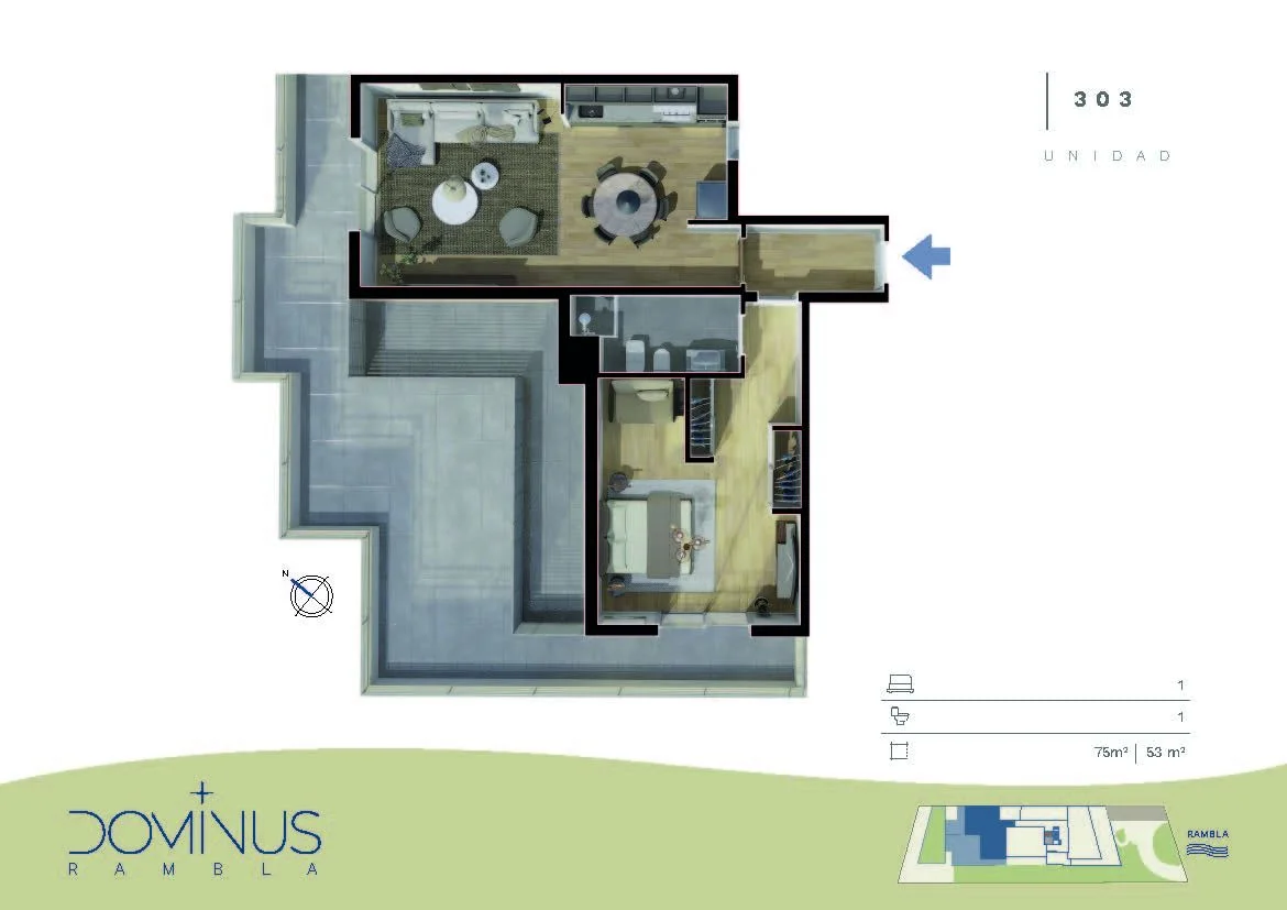 Se desarrolla en una superficie interior de 75m² y terraza de 53m². Te recibe un living comedor con cocina integrada y salida a terraza. Dormitorio con vestidor y salida a terraza. 1 baño completo. 1 garage y 1 cochera.