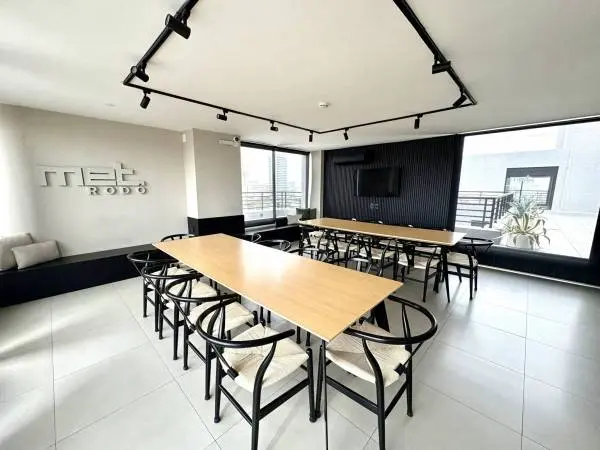 - Espacio co-work con estacion de servicios, puestos individuales y colectivos, kitchenette y terraza lounge