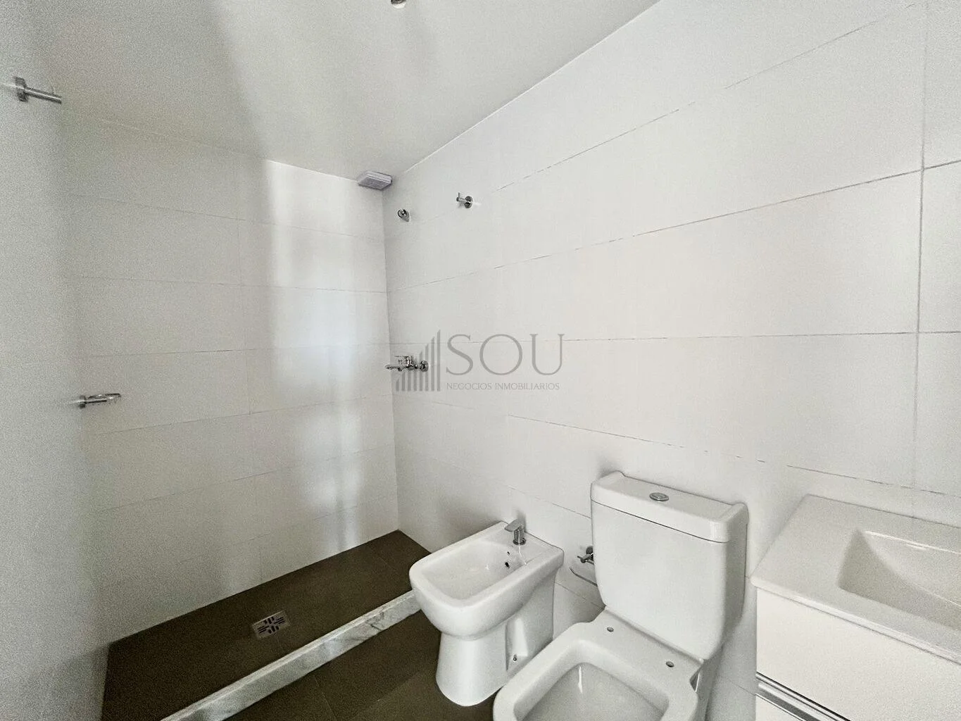Baño accesible, revestido en porcelanato, con mueble bajo pileta, aparatos sanitarios y griferías de excelente calidad.