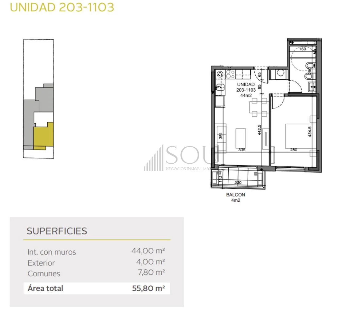 Apartamento con construcción tradicional de 44 m² interiores ubicado en un segundo piso, al frente, muy luminoso y silencioso, con terraza.