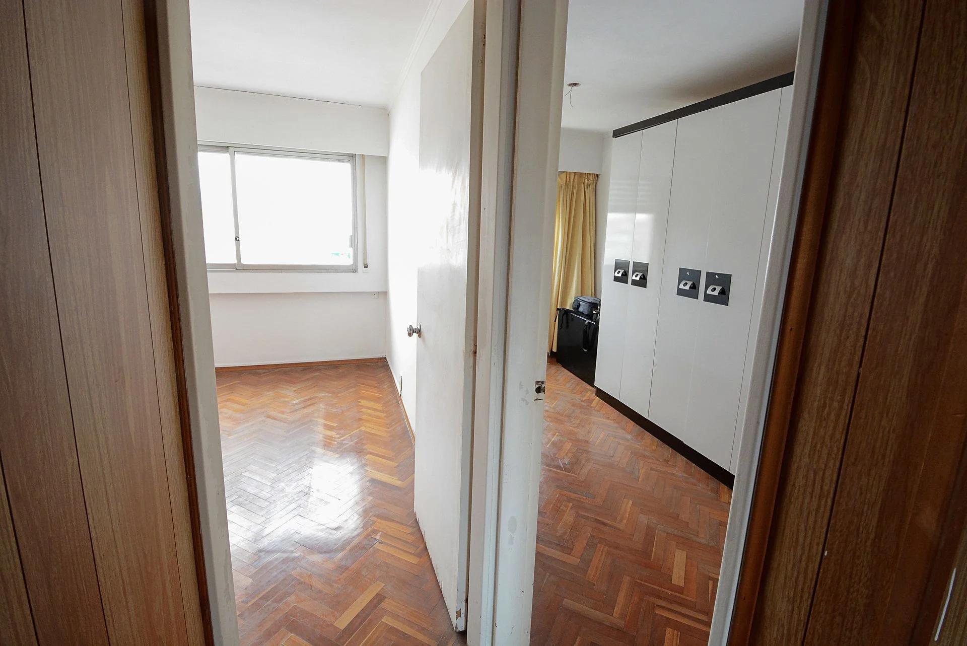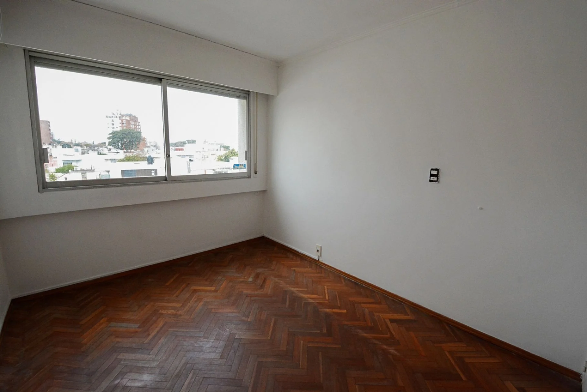 Dormitorio principal al contra frente con pisos de parquet y placares empotrados. Ventanal con muy buena vista despejada.
