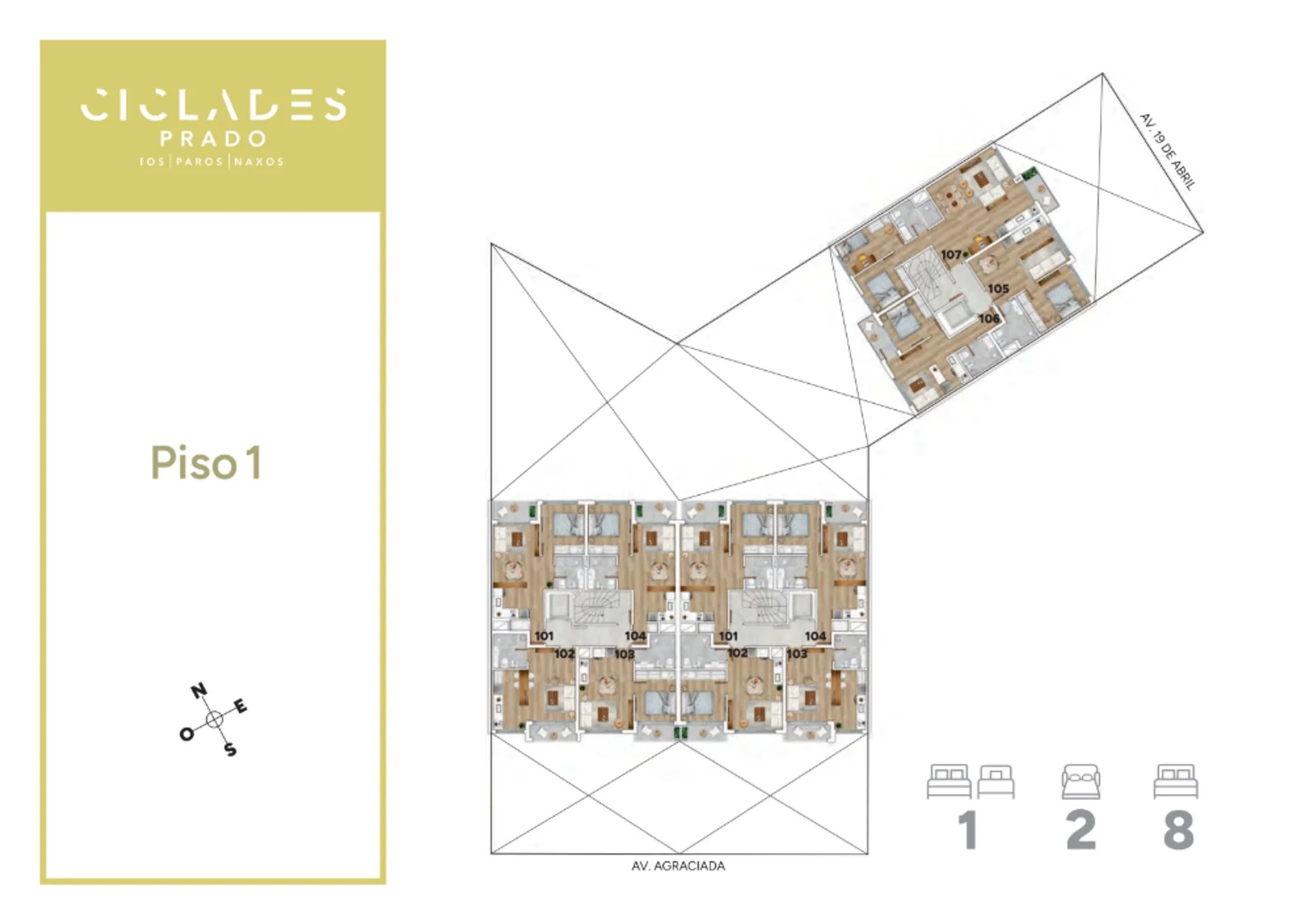 La unidad 102 se encuentra en Paros, cuenta con 39 m² interiores y 3 m² de terraza. Al ingresar, hacia la derecha se ubica el baño completo, mientras que a la izquierda se desarrolla la cocina integrada al living comedor, luego se encuentra el dormitorio con salida a la terraza.