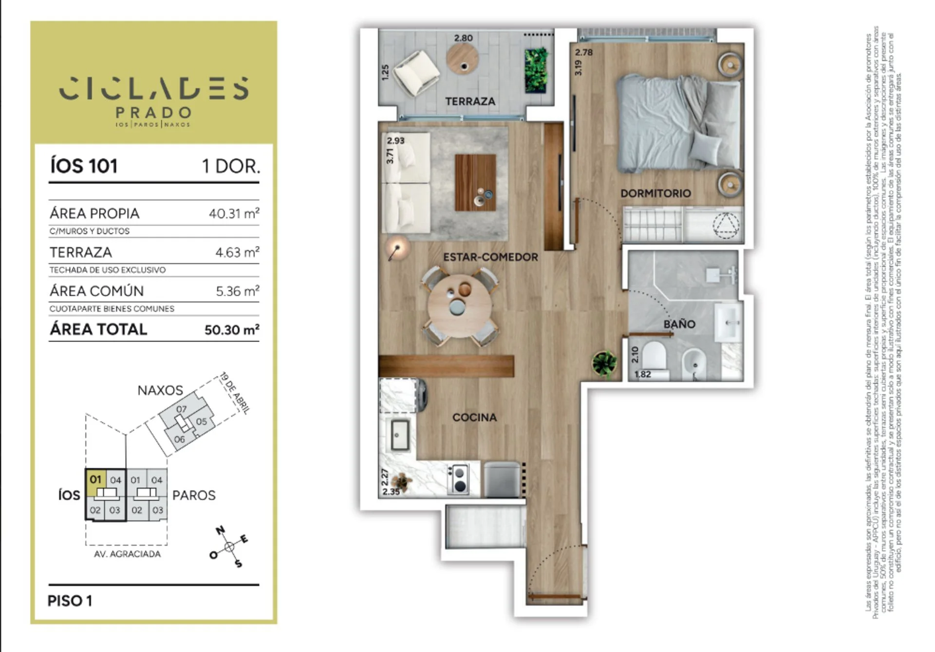 La unidad 101 se encuentra en IOS, cuenta con 40,31 m² interiores y 5,36 m² de terraza.