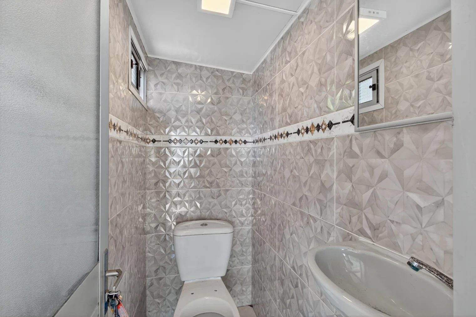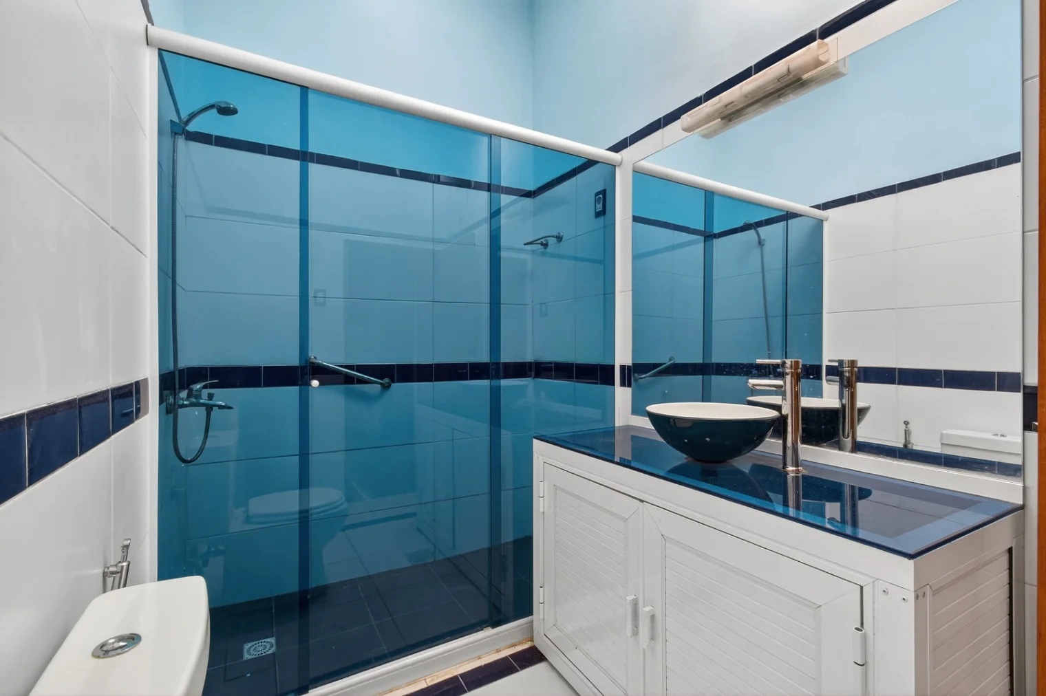 Baño principal reciclado con revestimientos cerámicos ducha con mampara y ventilación natural