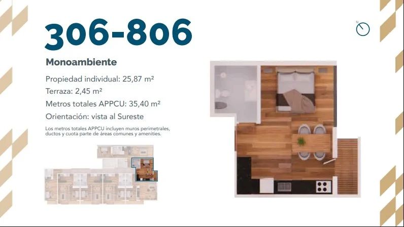 Ofrece monoambientes y apartamentos de 1 dormitorio, todos al frente con terraza propia, garantizando luz natural y vistas despejadas.