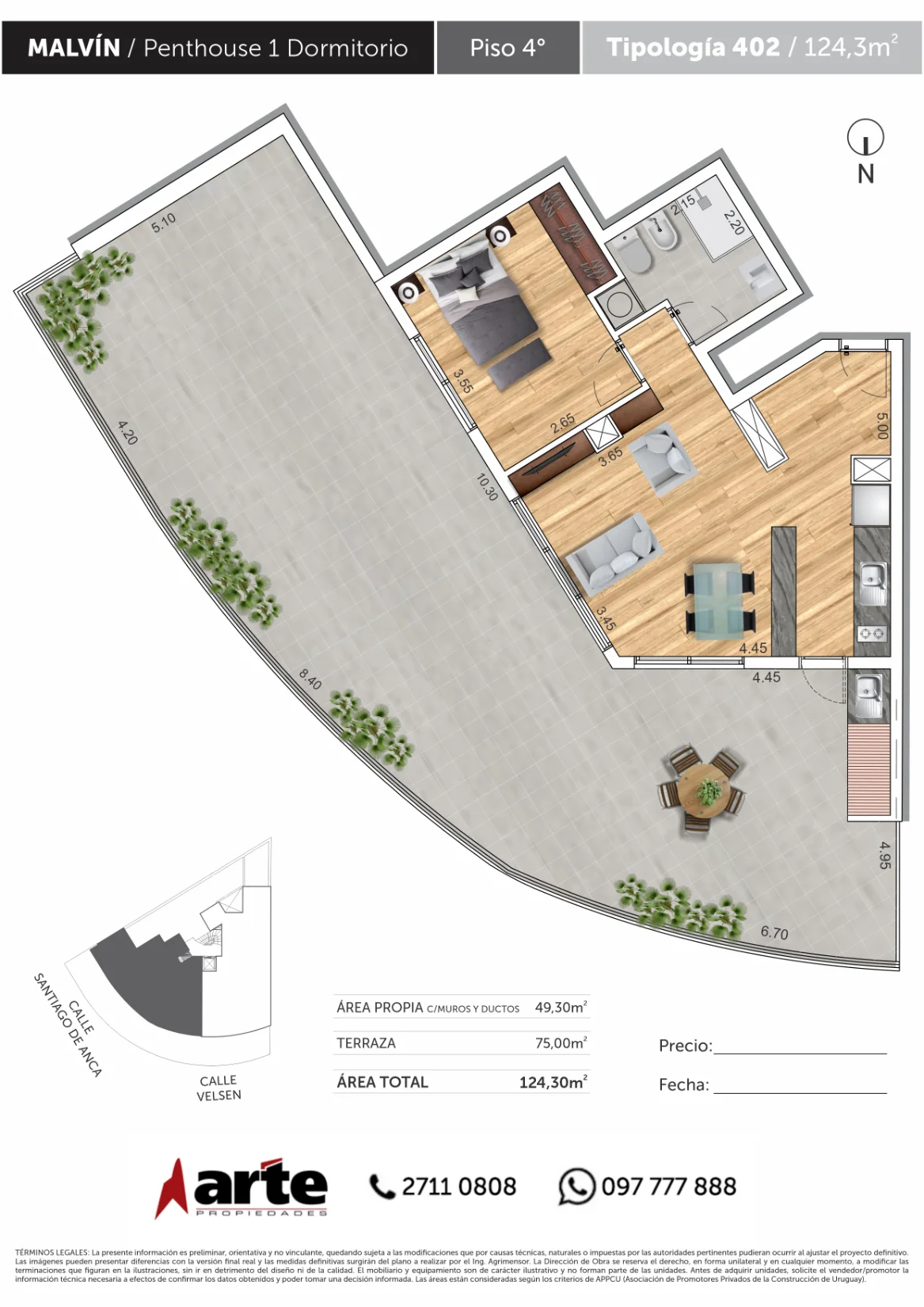 Proyecto en excelente zona del barrio Malvín. Muy próximo a la rambla y a la seccional N11 se policia, lo que le otorga mucha seguridad. Luz natural y ambientes amplios con mucha comodidad. Apartamento de 1 dormitorio con 75 m2 de terraza propia Parillero de uso exclusivo en terraza ESTRENA FINES 2026 Detalles: -todas las unidades cuentan con amplias terrazas al frente -aberuras con doble vidrio DVH -caríntería de excelente calidad -finas terminaciones -laundry con tender -automatismos a distancia en todos los accesos -video portero -video vigilancia Parrillero común exterior y zon de tenders en piso 4. Garajes disponibles, consultar disponibilidad (no inlcuidos en el precio). Consulta por asesoramiento profesional!