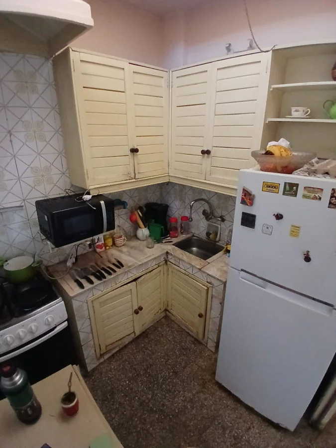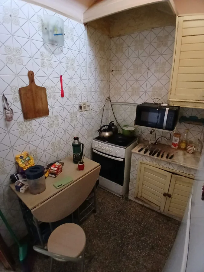 La cocina definida es compacta y funcional, equipada con mesada de granito, varios enchufes disponibles y acceso directo al área de servicio. Tiene puerta plegable y ventilación natural a través de una ventana de hierro tipo banderola, lo que la hace práctica y fácil de mantener.