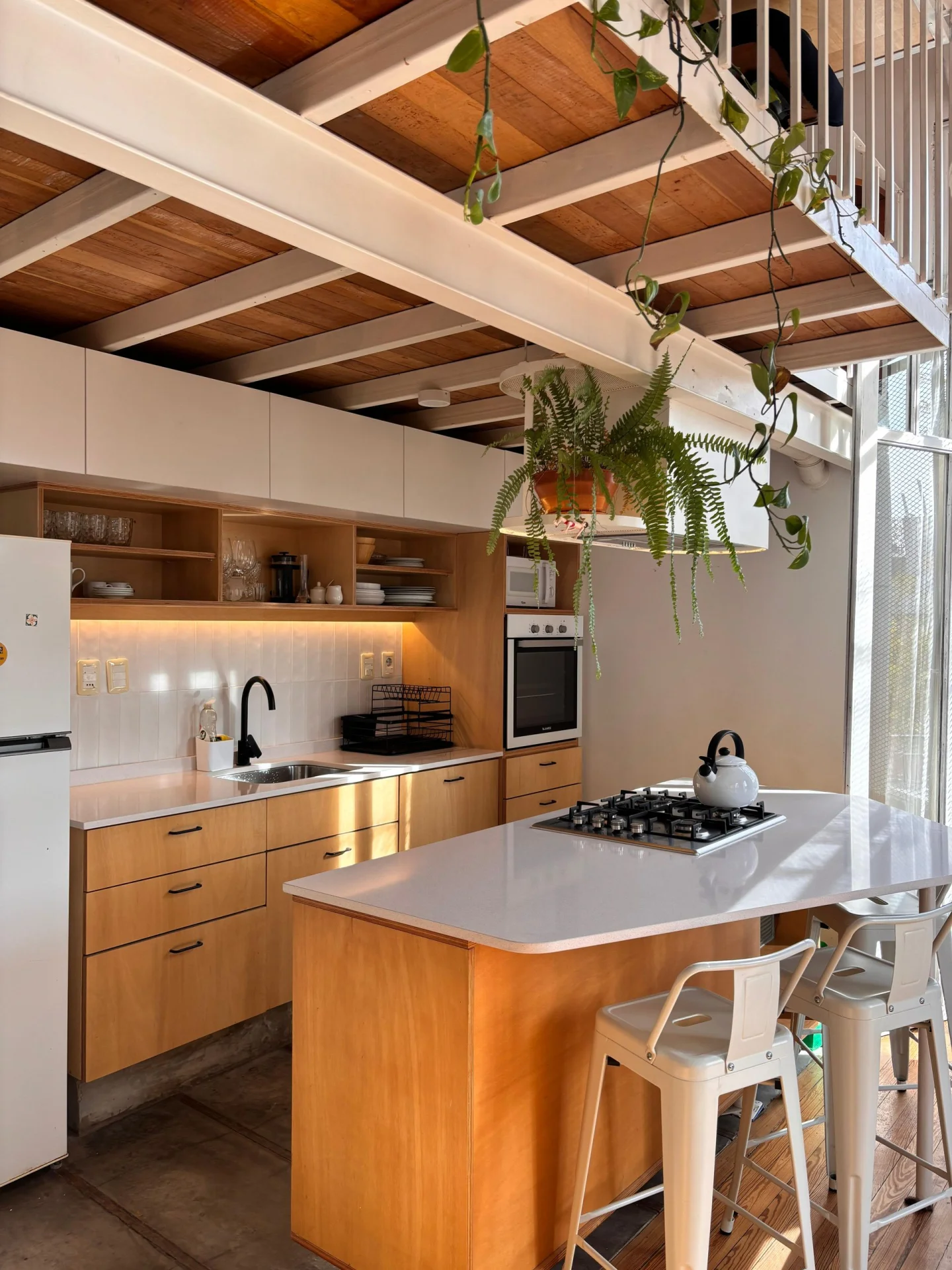 Se accede a hall con espacio de guardado, luego pasamos a un amplio living comedor en doble altura, con cocina integrada con isla, a nuevo, con anafe y gran campana central y horno empotrado, salida a terraza lavadero. El ambiente tiene doble orientación y salida a dos terrazas al frente, cuenta con estufa de alto rendimiento y aire acondicionado. Un dormitorio amplio, con placares y ventanal con salida a balcón. Entrepiso que funciona como escritorio o segundo dormitorio. Un baño completo también actualizado, con bañera.