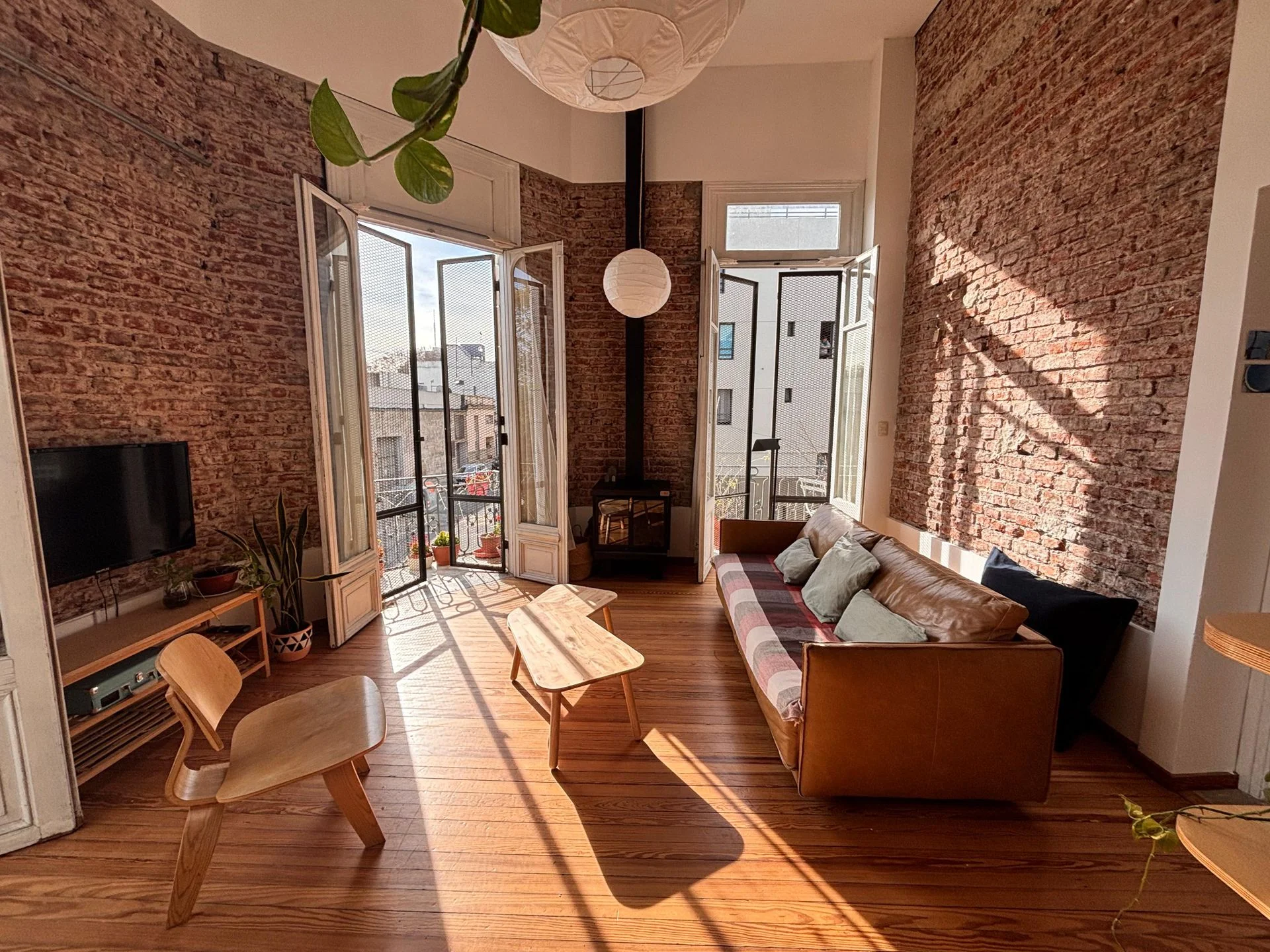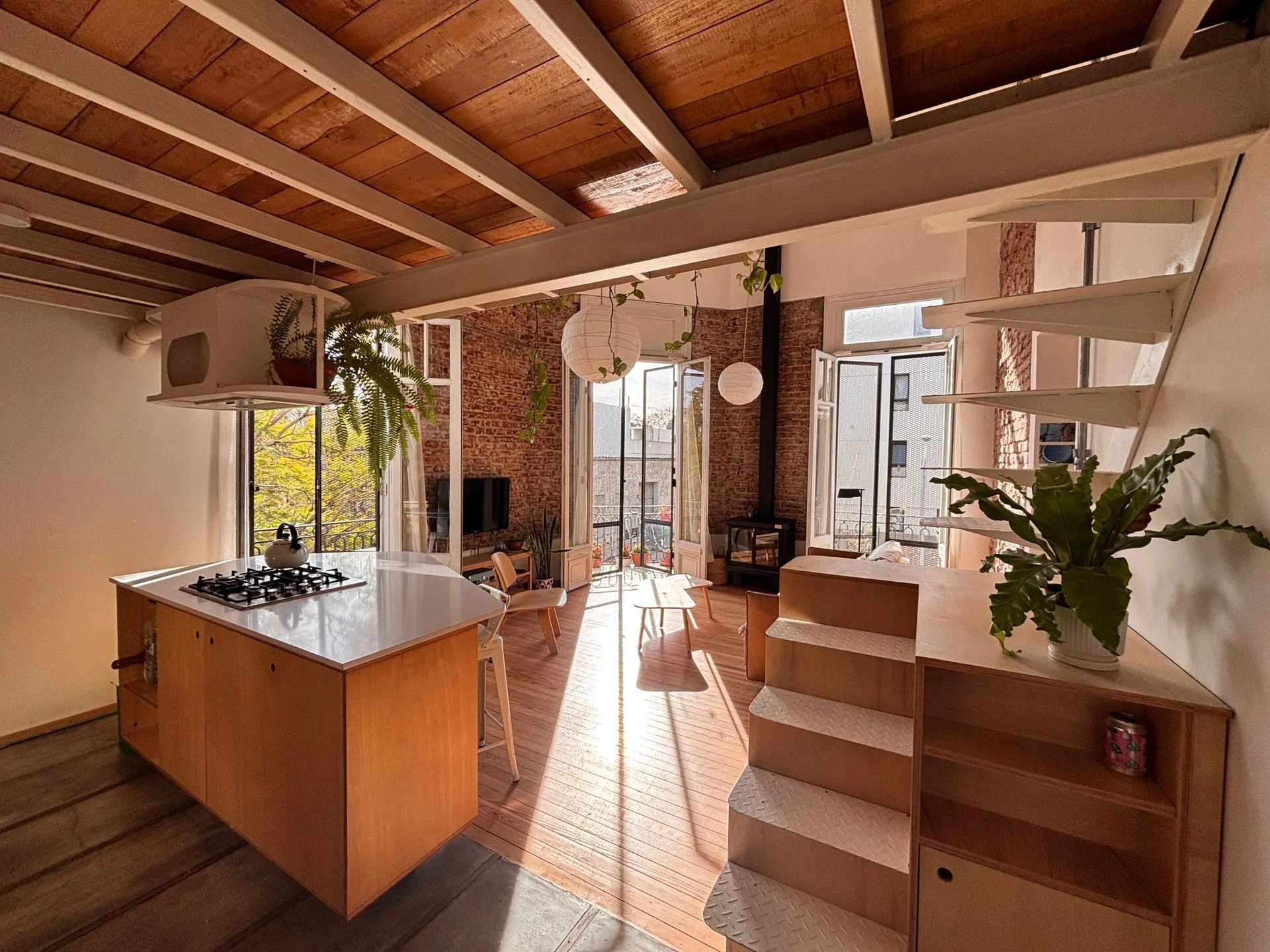 Se accede a hall con espacio de guardado, luego pasamos a un amplio living comedor en doble altura, con cocina integrada con isla, a nuevo, con anafe y gran campana central y horno empotrado, salida a terraza lavadero. El ambiente tiene doble orientación y salida a dos terrazas al frente, cuenta con estufa de alto rendimiento y aire acondicionado. Un dormitorio amplio, con placares y ventanal con salida a balcón. Entrepiso que funciona como escritorio o segundo dormitorio. Un baño completo también actualizado, con bañera.