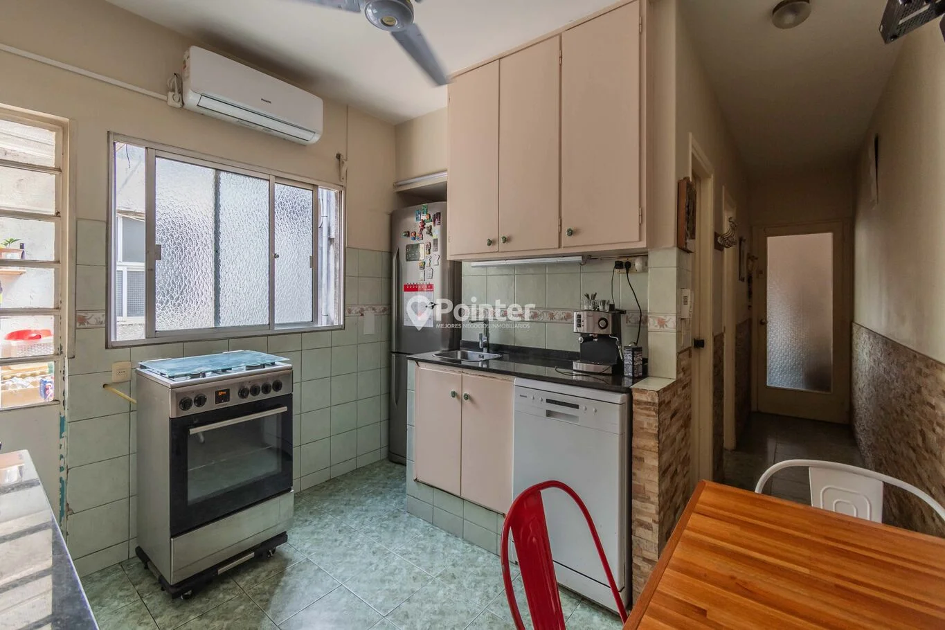 Siguiendo por pasillo nos encontramos con baño social, un dormitorio, cocina con salida a pequeña terraza, baño completo y dos grandes dormitorios. con placares empotrados.