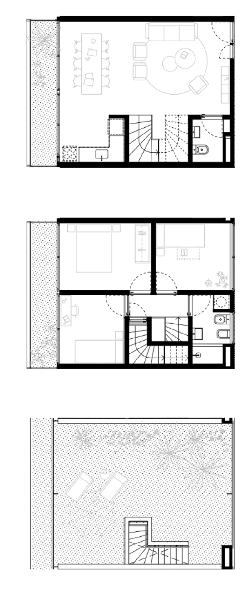 En la planta superior encontramos los 3 dormitorios, un baño completo, y otra terraza con vista al mar.
