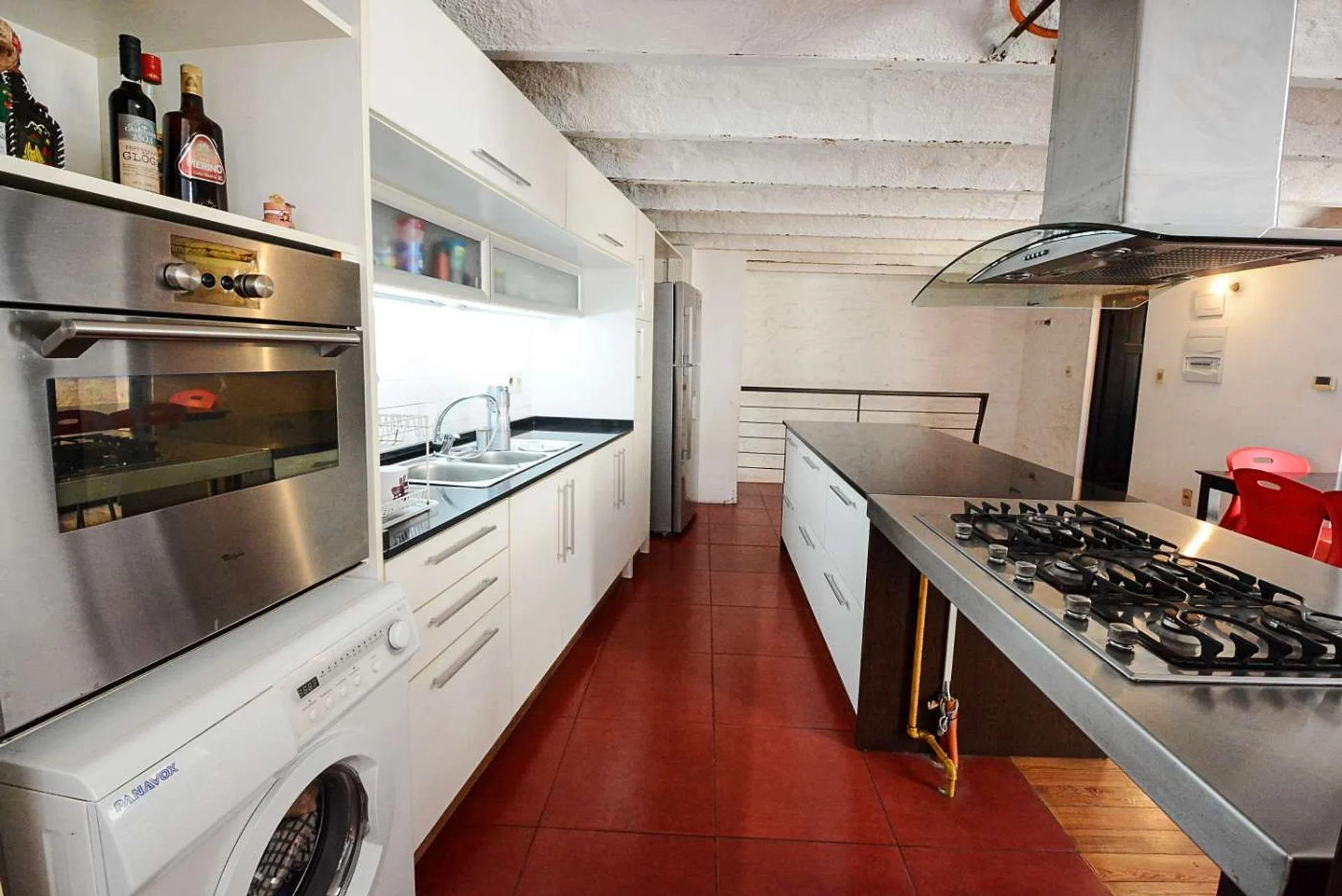En el piso superior se desarrolla una planta tipo loft, con increíble iluminación natural, donde se destaca una amplia cocina integrada con doble mesada, una isla central con anafe empotrado y campana extractora, y enfrentada a lo largo de la pared medianera, mesada con pileta doble de acero inoxidable y grifería monomando, horno empotrado, conexión para lavarropas y placares sobre y bajo mesada que proporcionan amplio lugar de guardado.