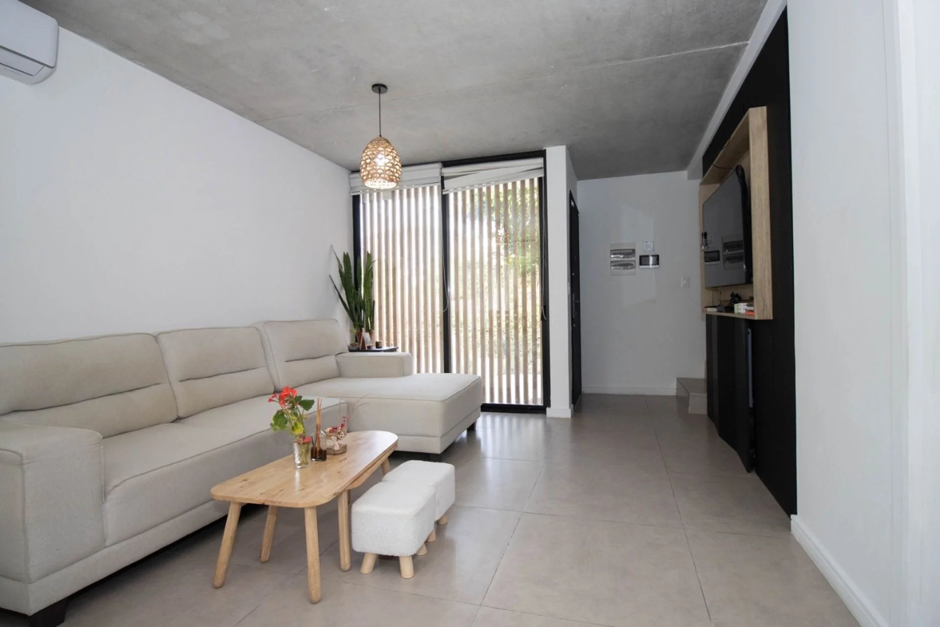 El living con cocina integrada se destaca por sus terminaciones modernas, aberturas en aluminio con vidrio DVH y excelente entrada de luz natural.
