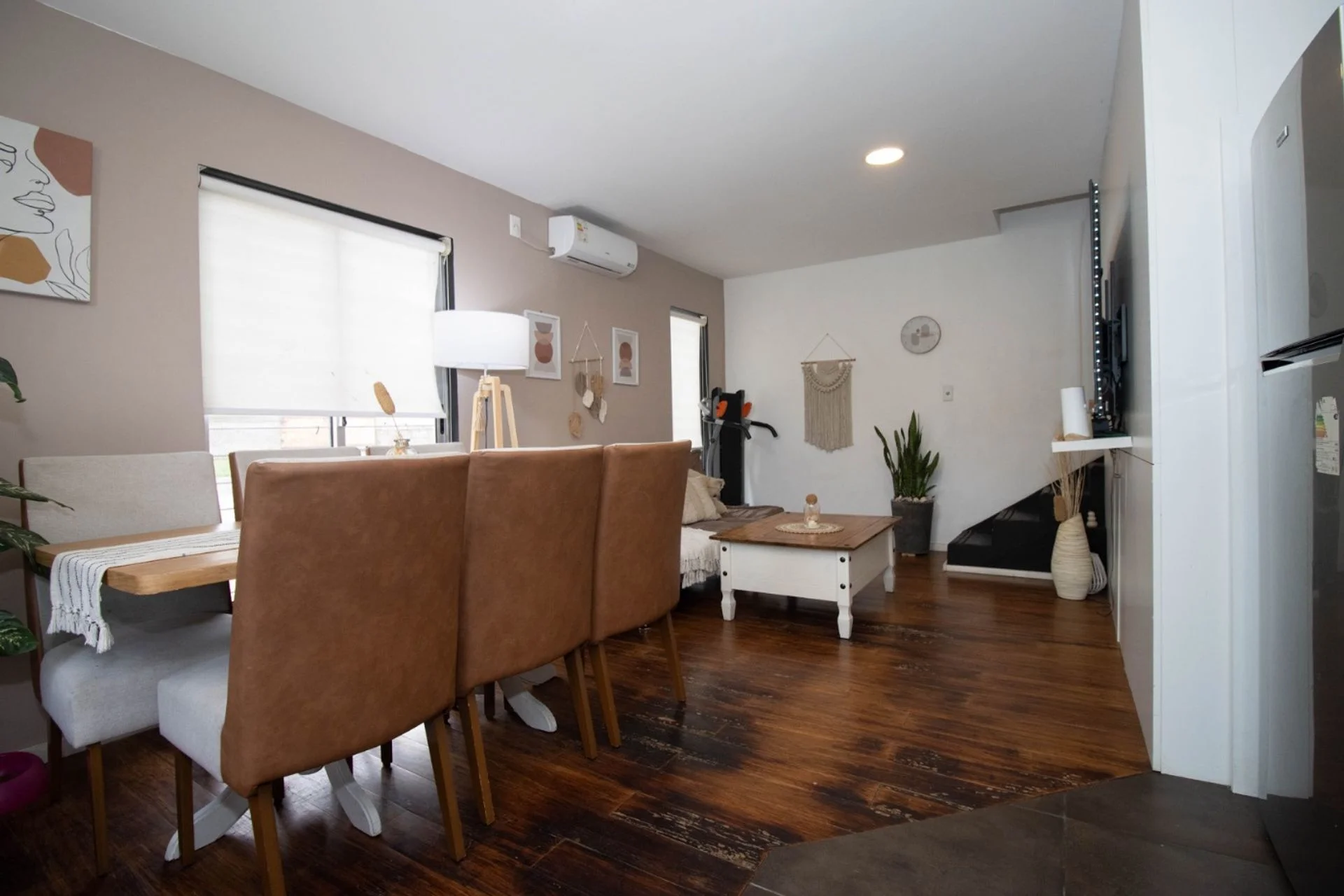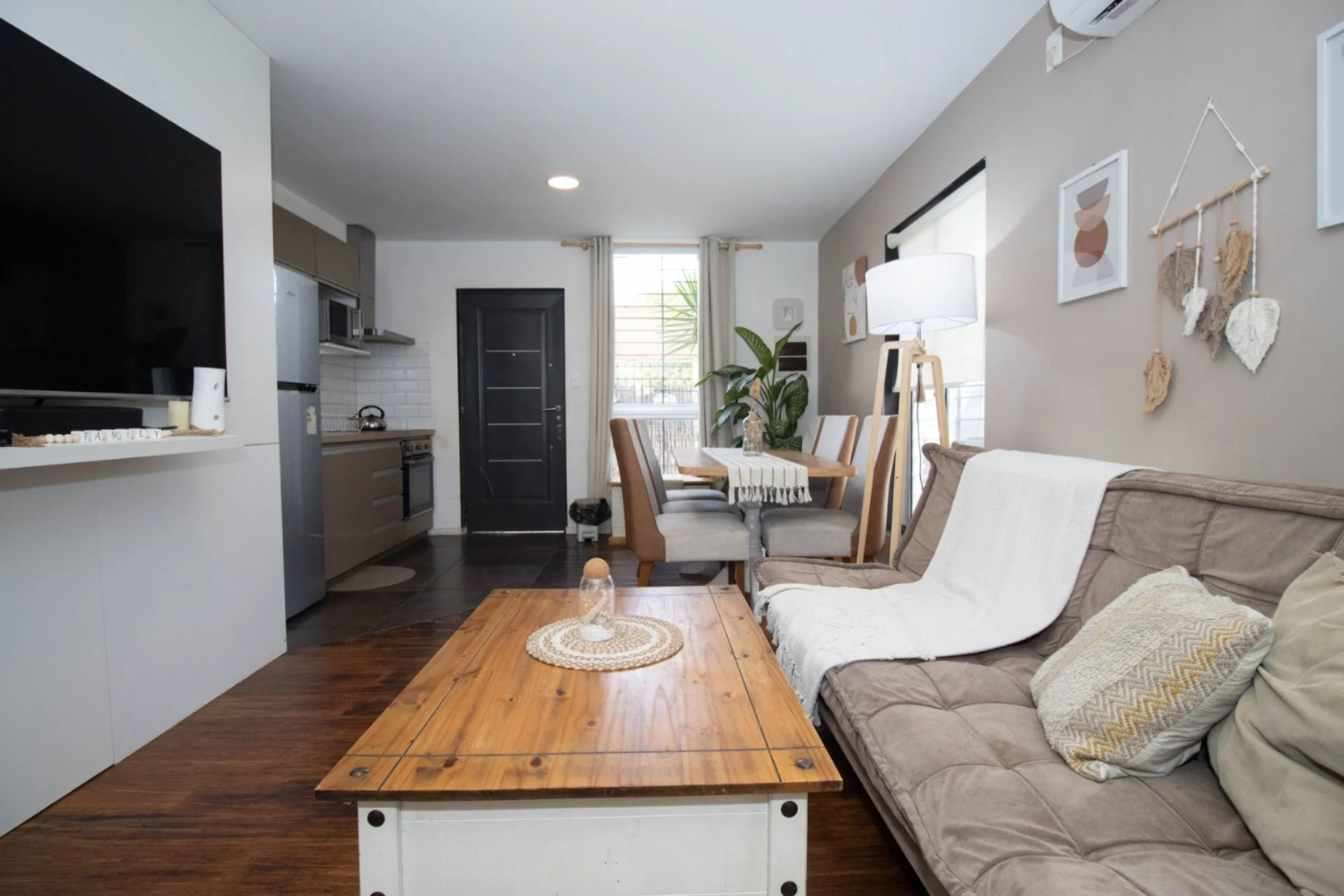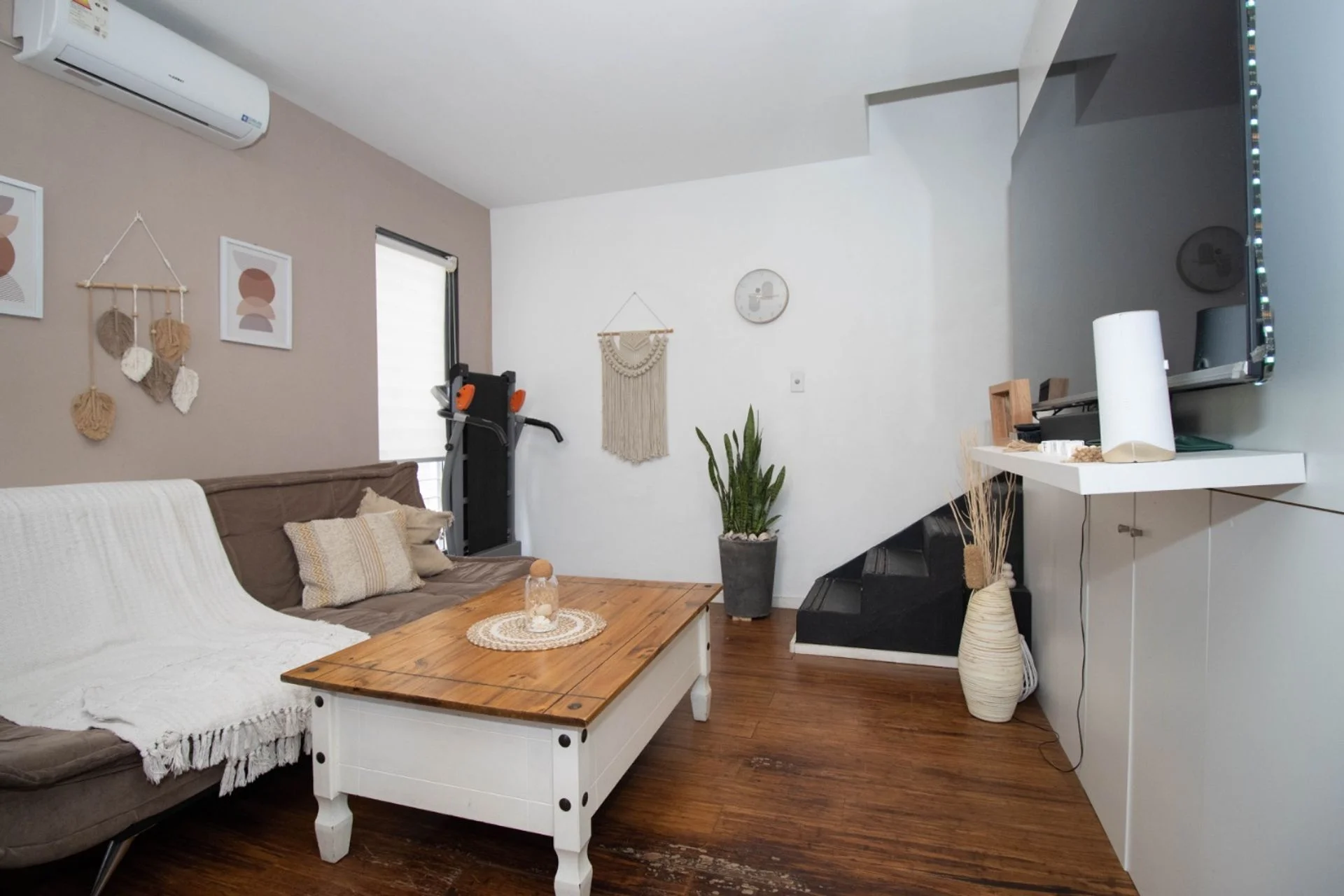 En planta baja cuenta con living con cocina integrada, semi equipada y con aire acondicionado. En planta alta dispone de dos dormitorios luminosos y un baño completo.