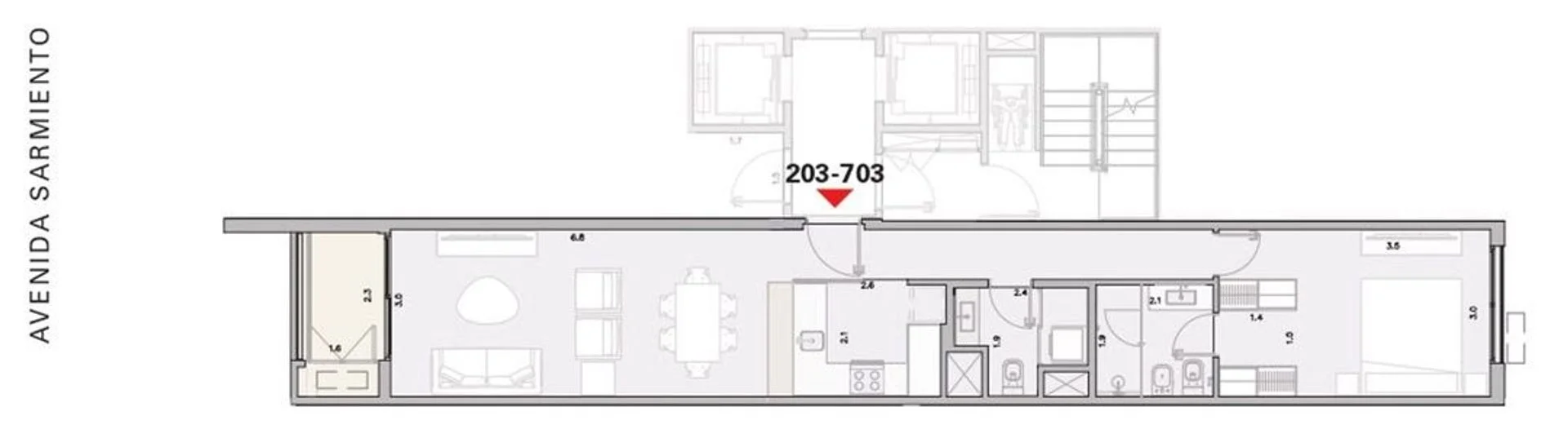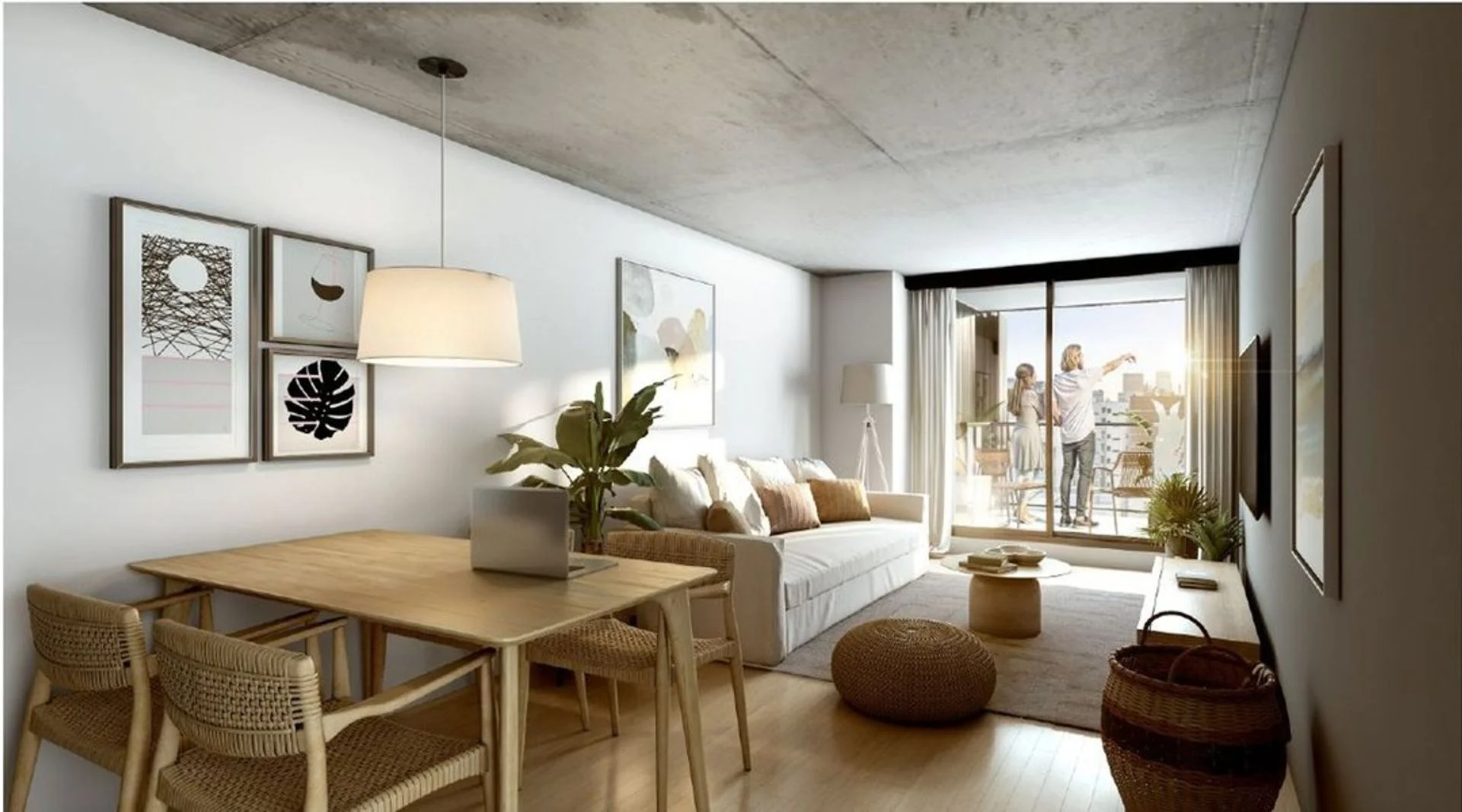 Apartamento de ambientes muy amplios, Living comedor de 7 x 3 con terraza al frente, cocina integrada, baño social con lugar para lavarropas, dormitorio con vestidor y baño en suite.
