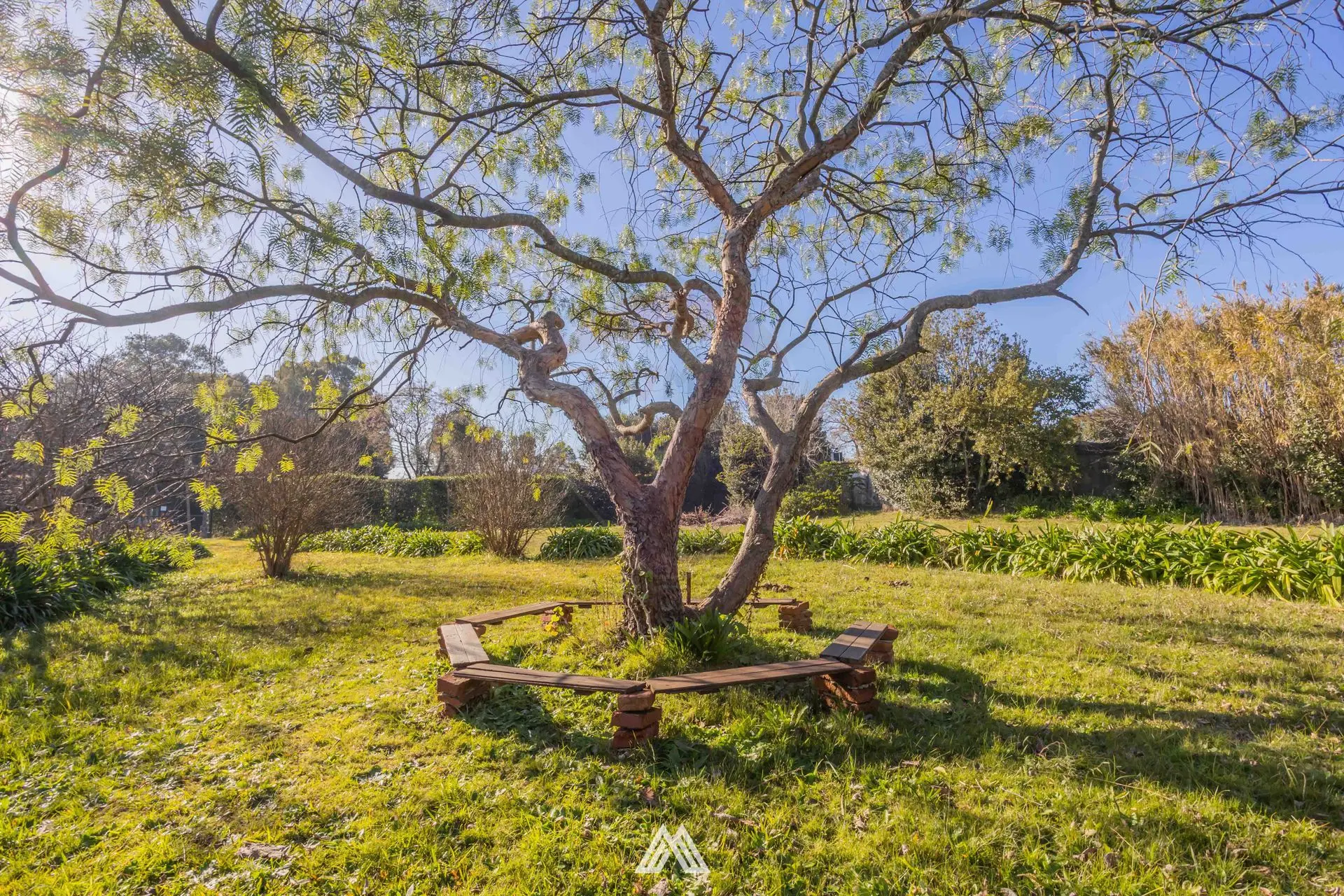 El jardín es extenso y hermosamente diseñado, con gran variedad de plantas, espacios verdes. La propiedad esta delimitada tanto por mojones como por barreras naturales formadas por cañas y vegetación.