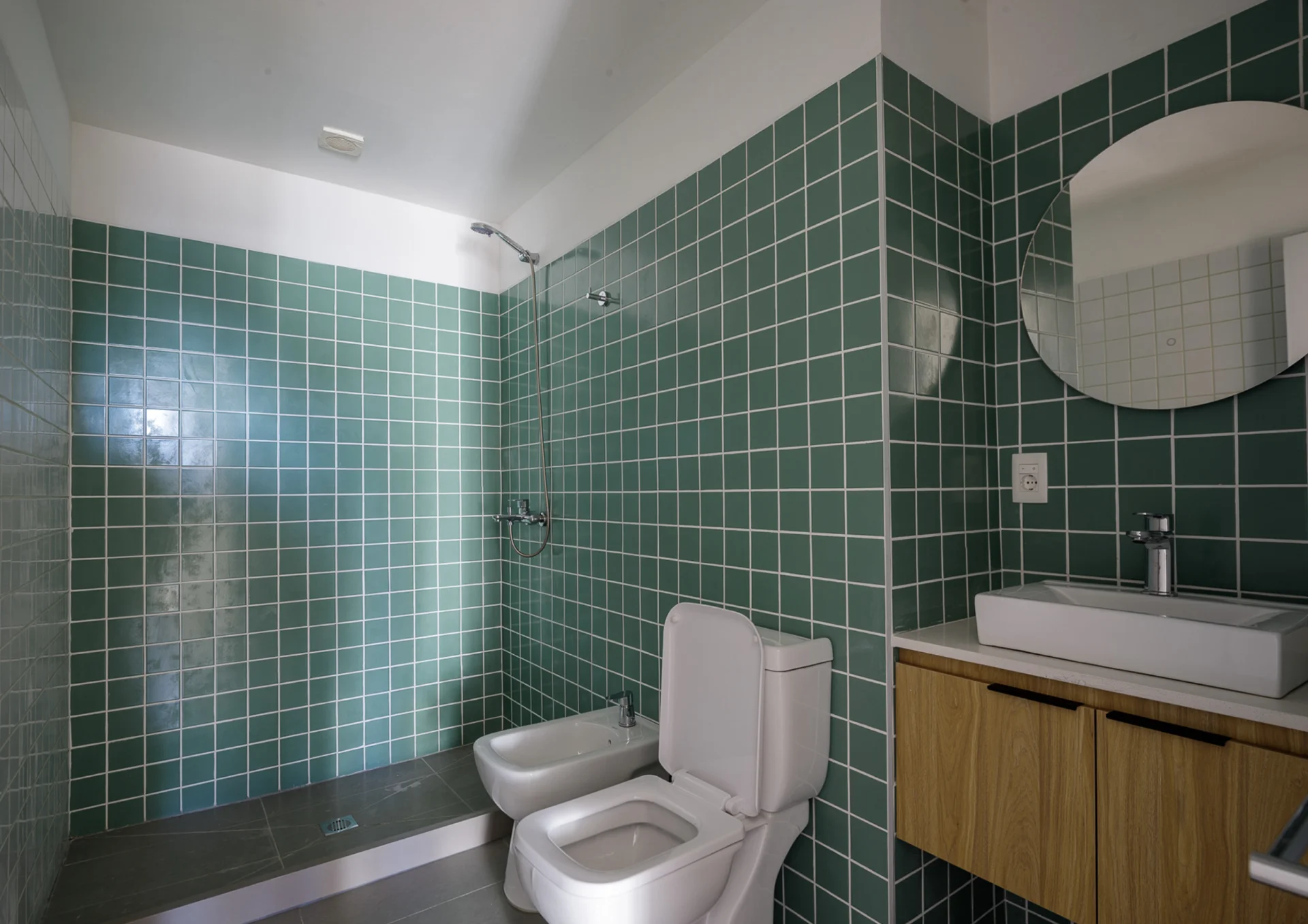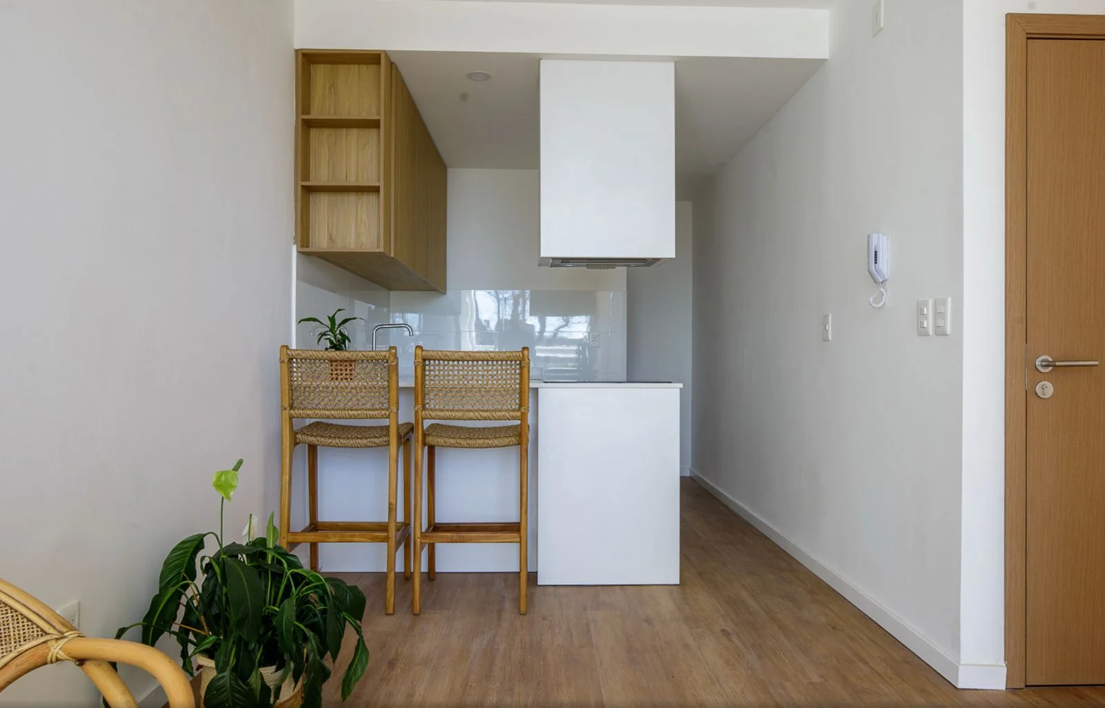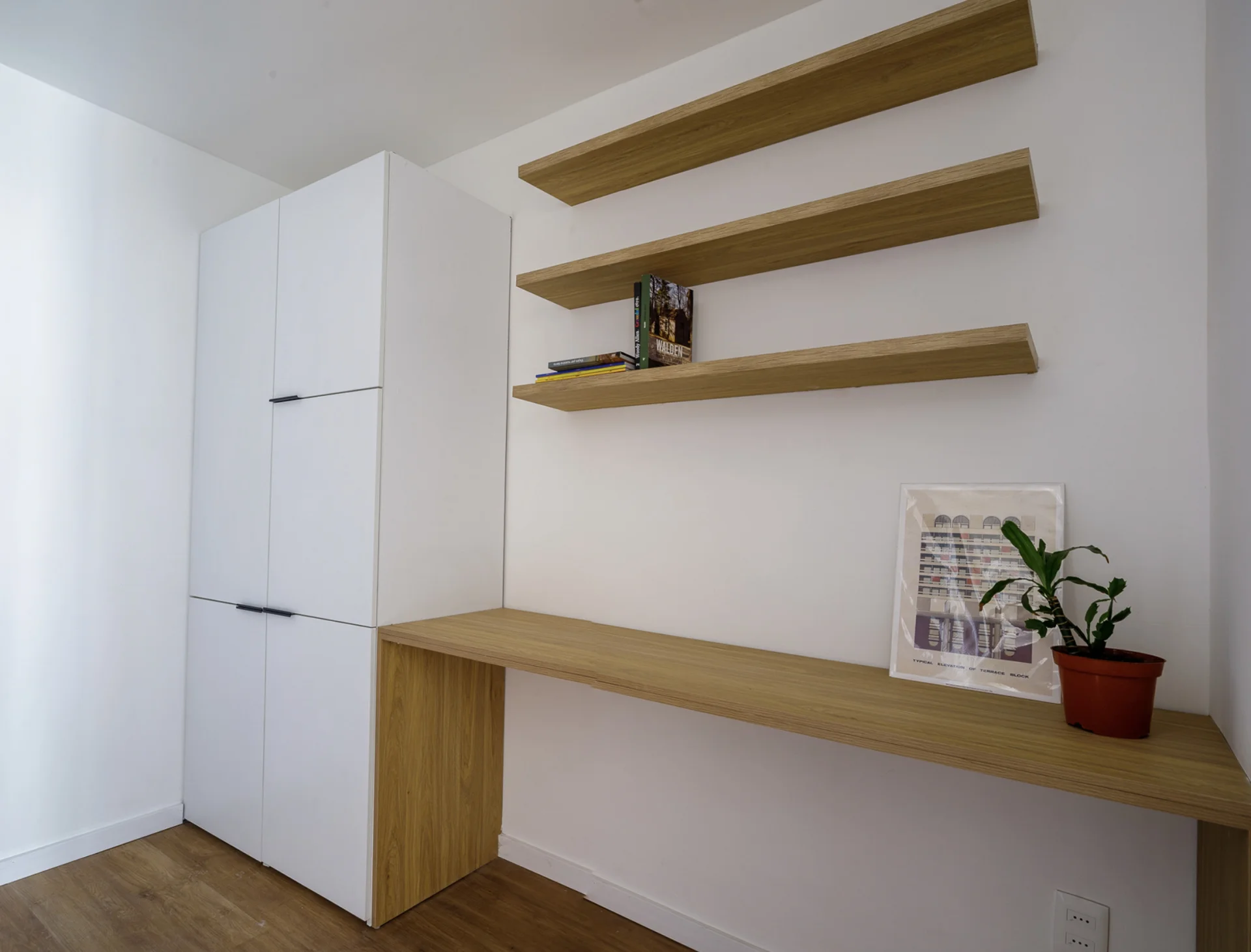 Un espacio de distribución conecta los ambientes y está aprovechado con un escritorio empotrado y estantes de madera, perfecto para home office o estudio. El baño, revestido en cerámica verde, combina modernidad y frescura con un diseño actual y funcional.