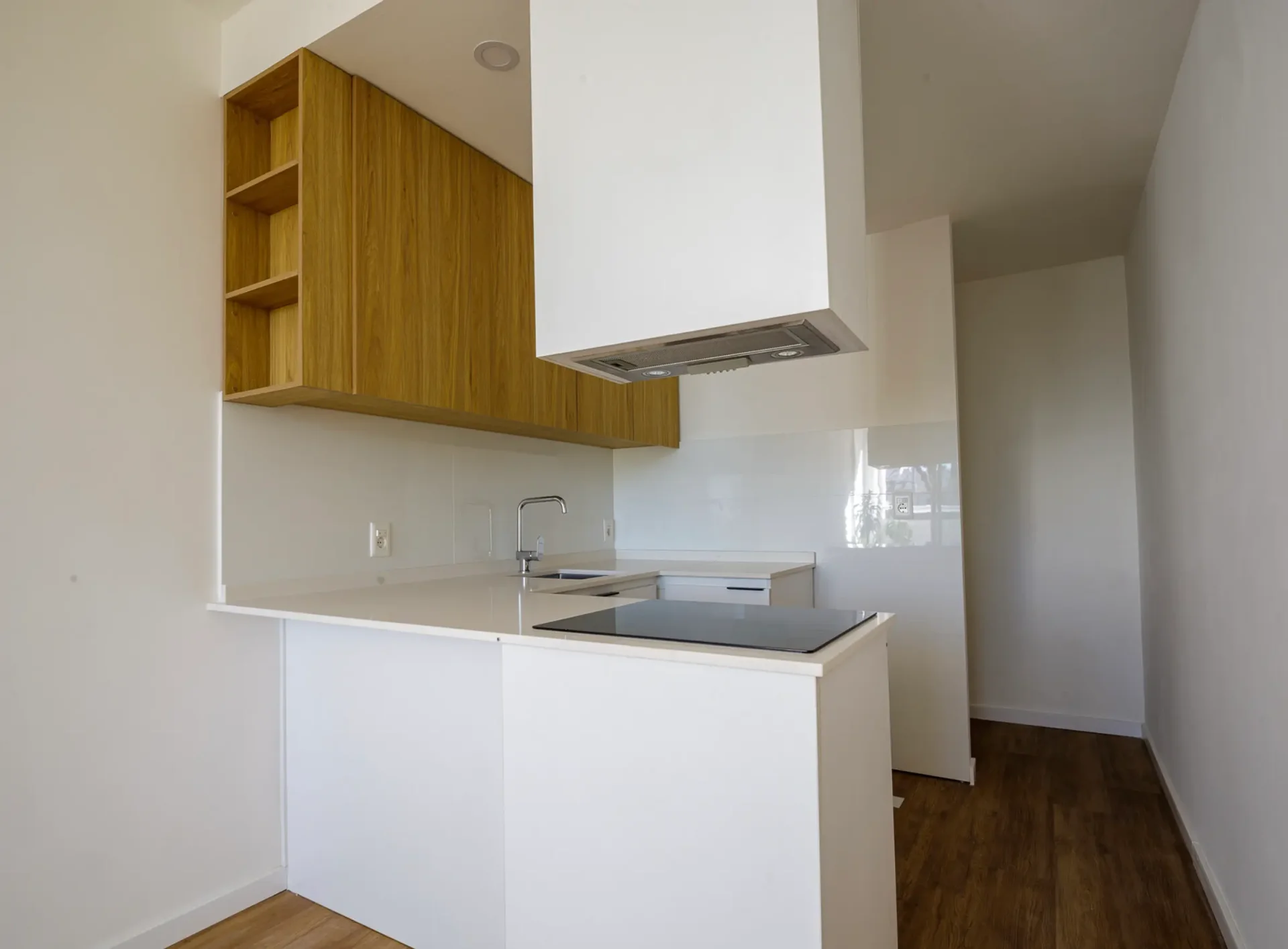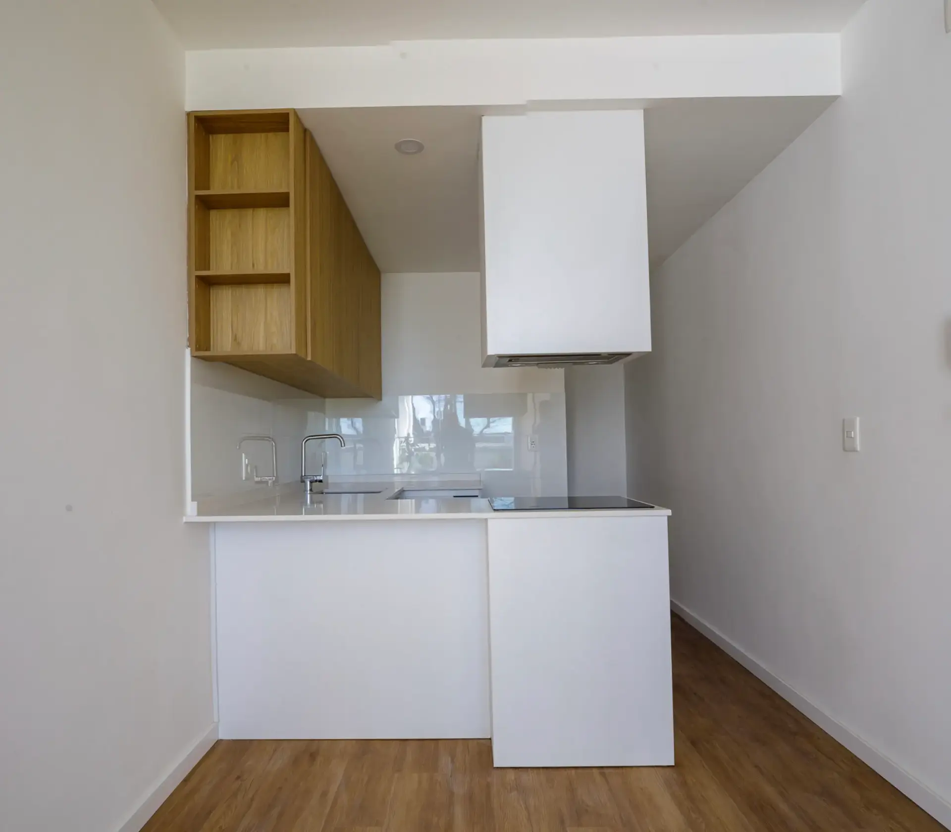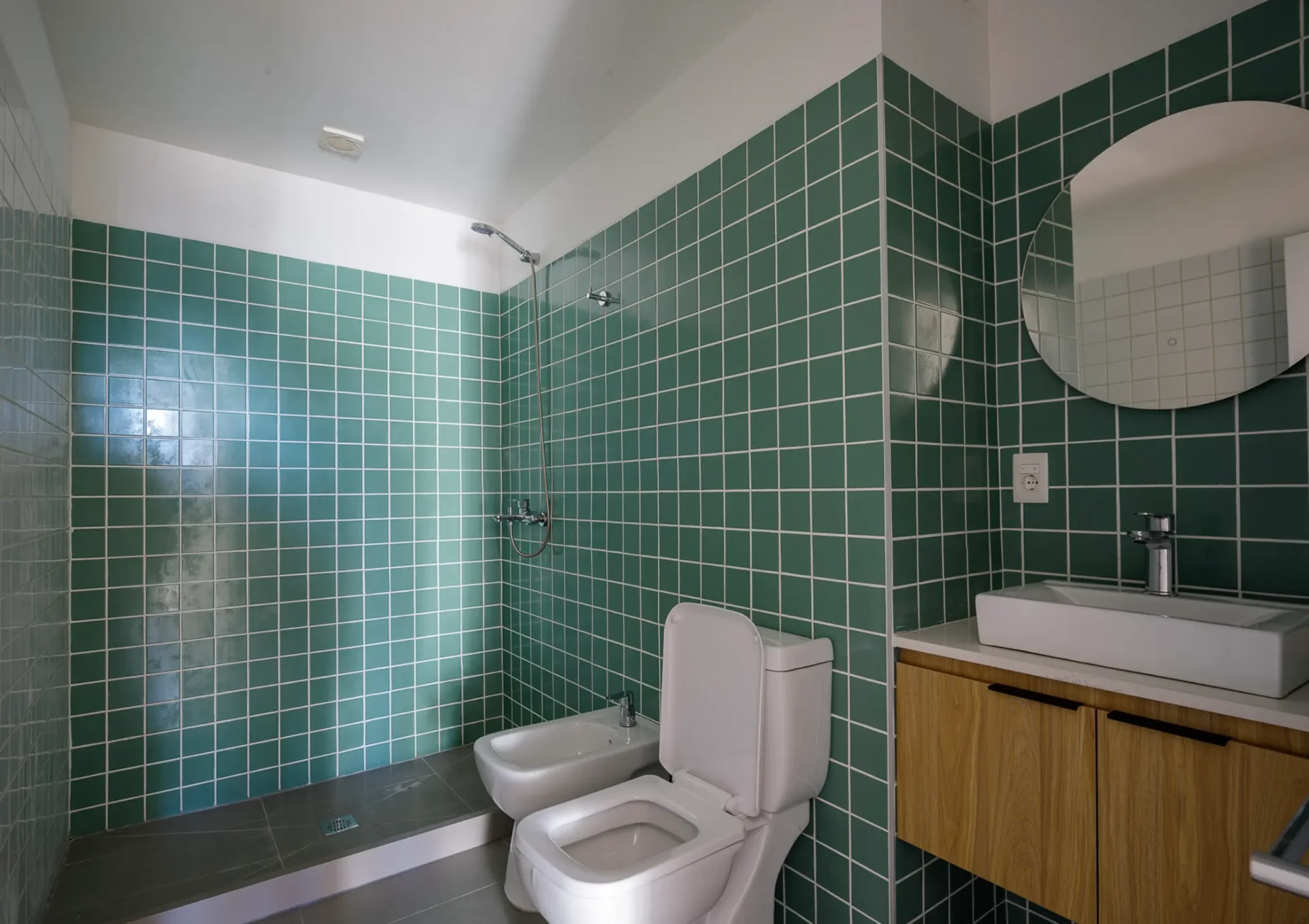 Un espacio de distribución conecta los ambientes y está aprovechado con un escritorio empotrado y estantes de madera, perfecto para home office o estudio. El baño, revestido en cerámica verde, combina modernidad y frescura con un diseño actual y funcional.