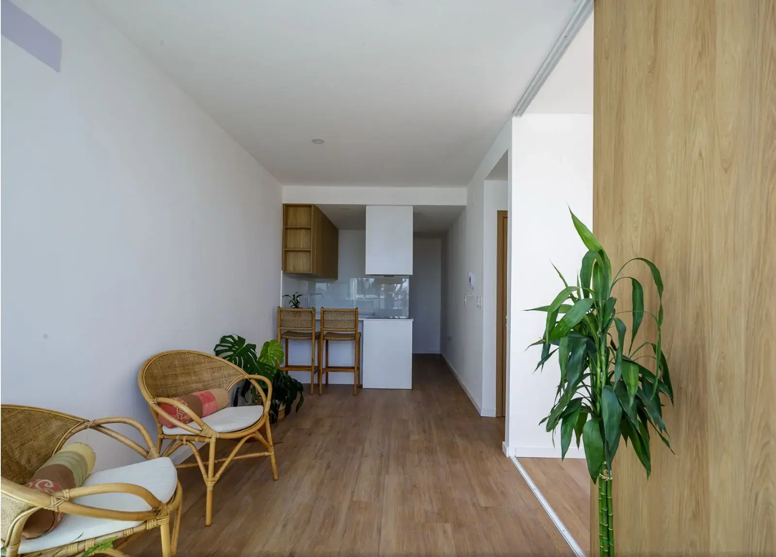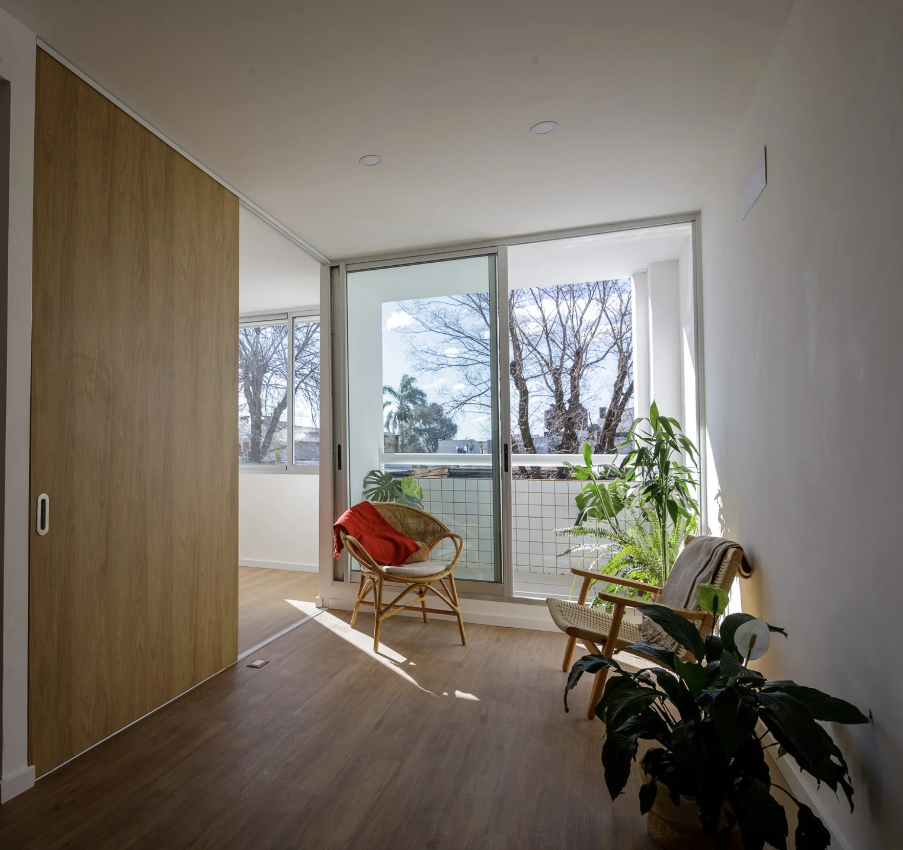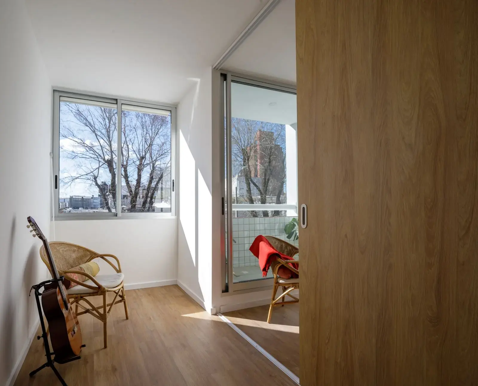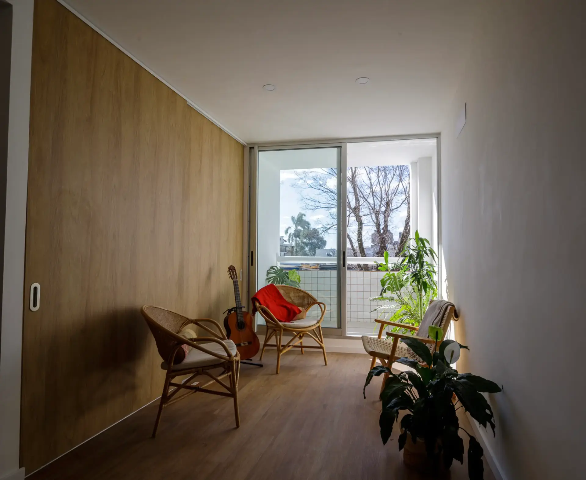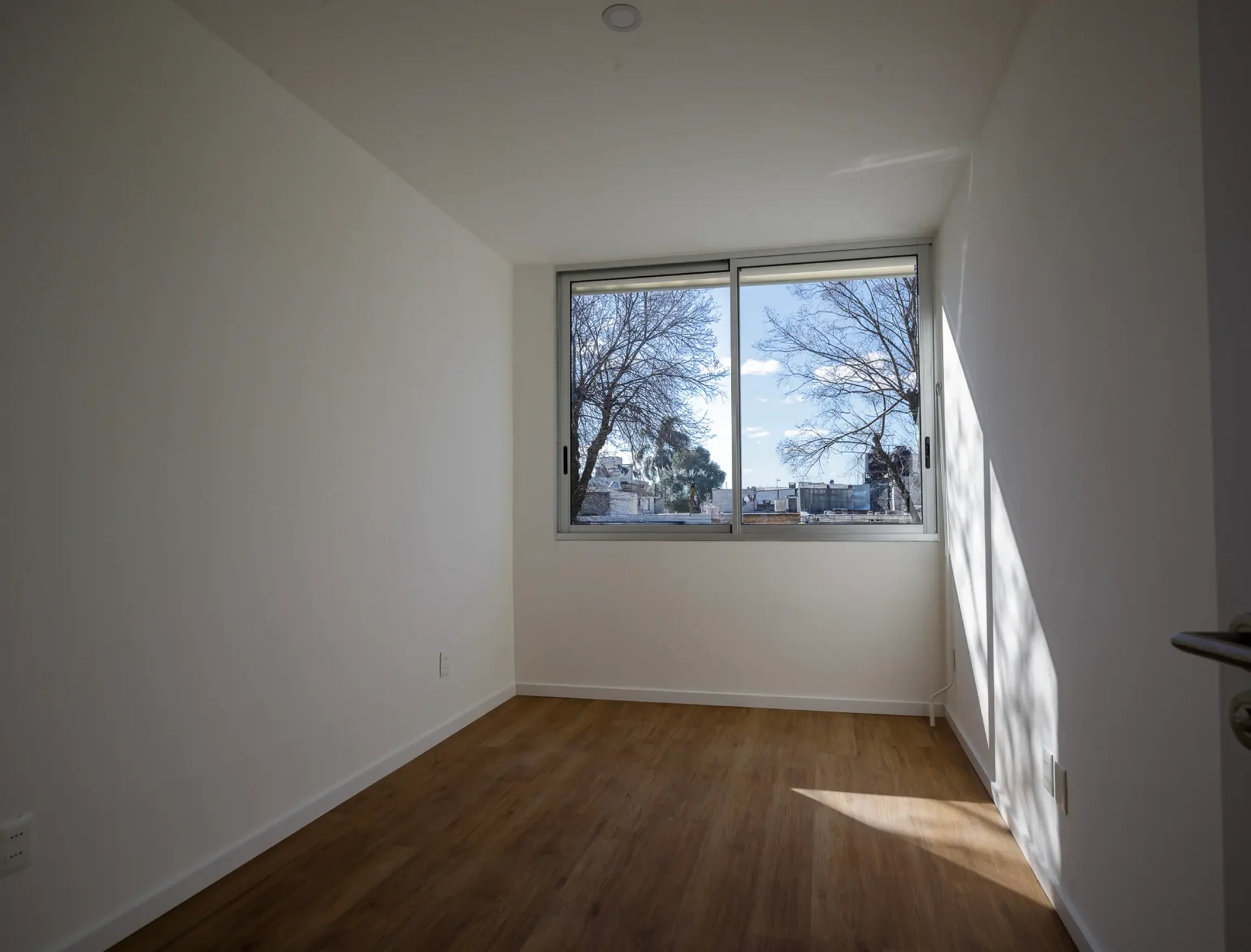 El primer dormitorio, de dimensiones cómodas, puede funcionar como espacio independiente gracias a su puerta de acceso, pero también se integra al living a través de una puerta corrediza de madera, lo que lo convierte en una opción ideal para estudio, escritorio o incluso un ambiente multifuncional. El segundo dormitorio, más amplio, cuenta con grandes ventanales que potencian la luz natural y la sensación de amplitud.