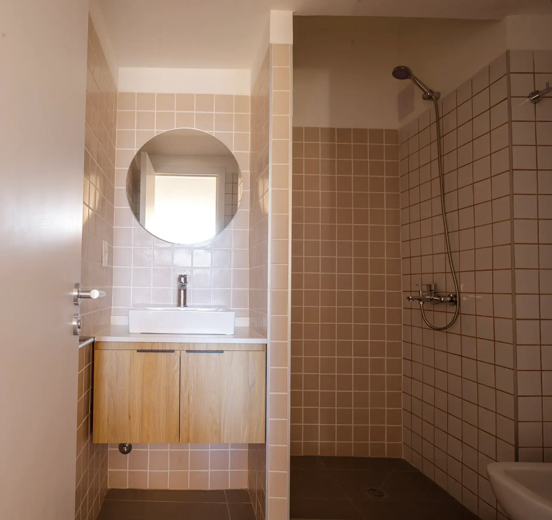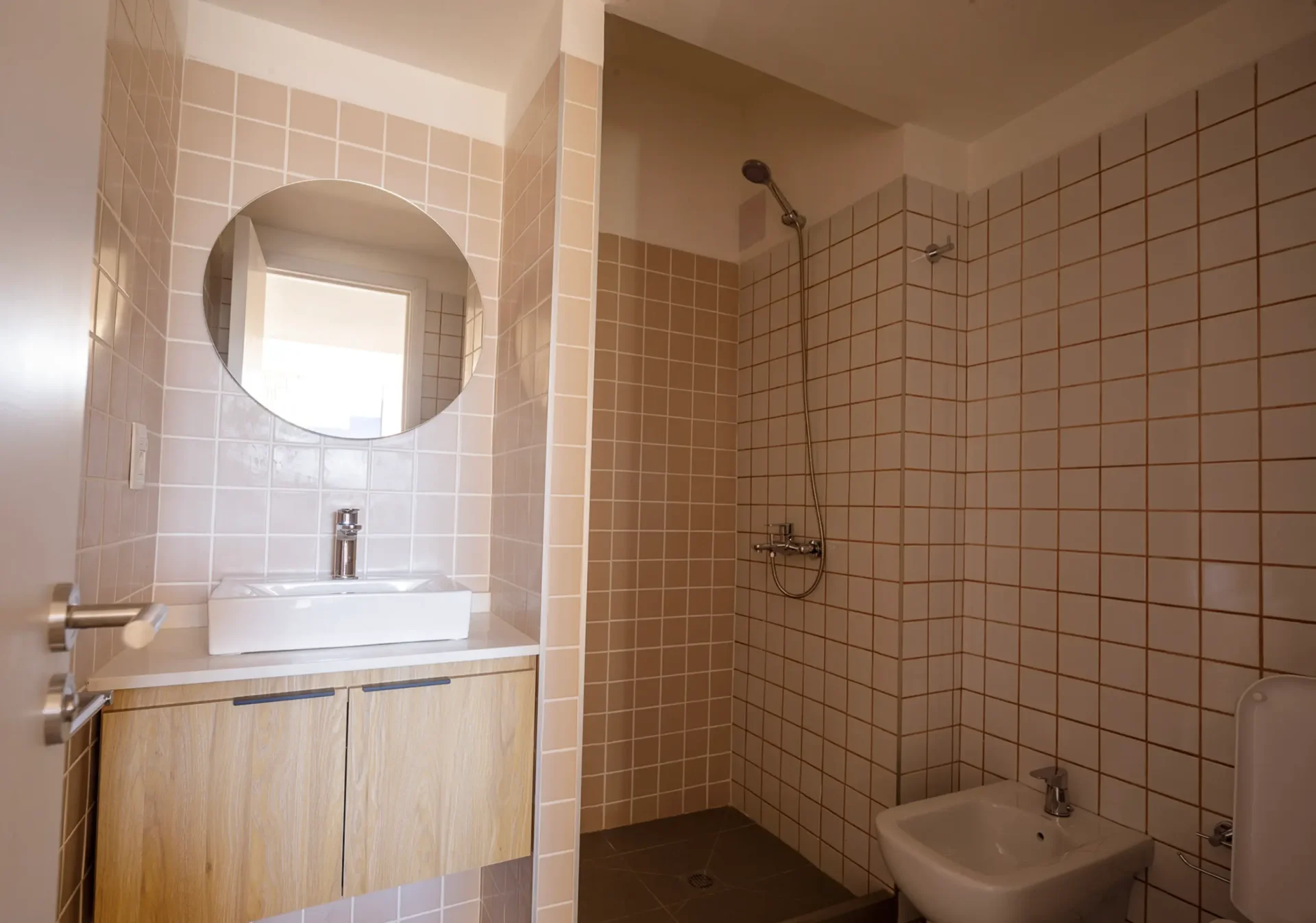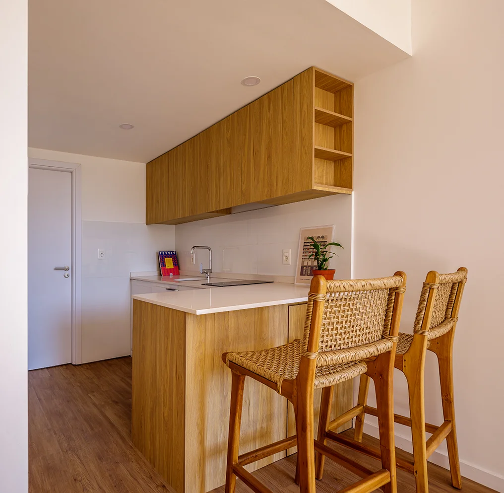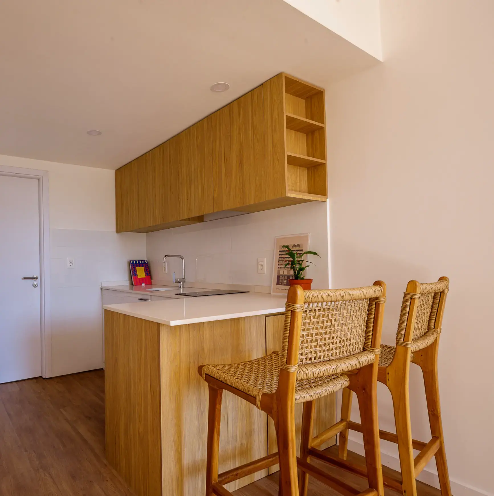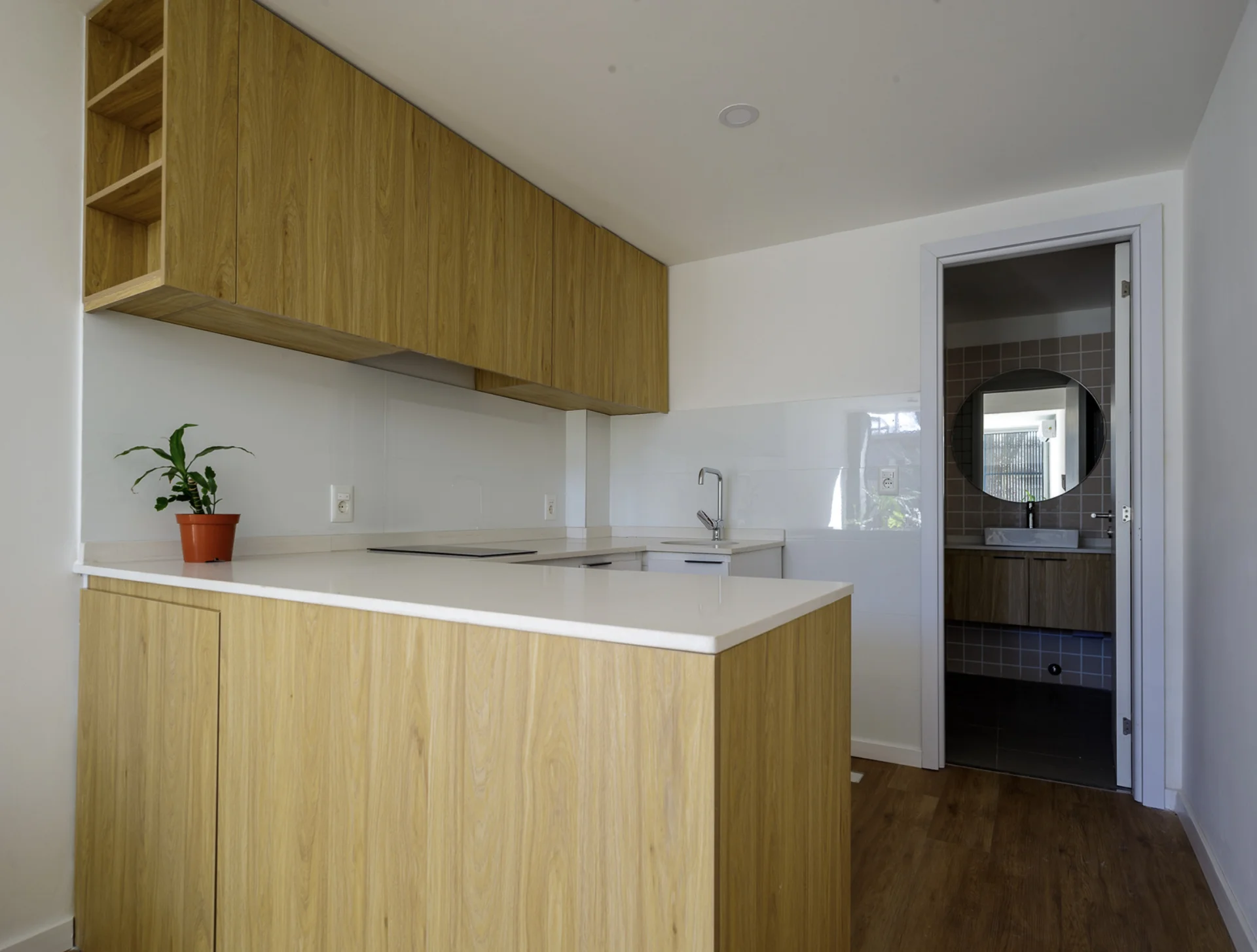 La cocina integrada, con barra y detalles en madera clara, se entrega equipada y pensada para optimizar cada espacio, manteniendo un estilo contemporáneo y funcional. Cuenta con vitrocerámica y horno empotrado. El baño, revestido en cerámicas le aportan personalidad y frescura, cuenta con todas las comodidades de un diseño actual.