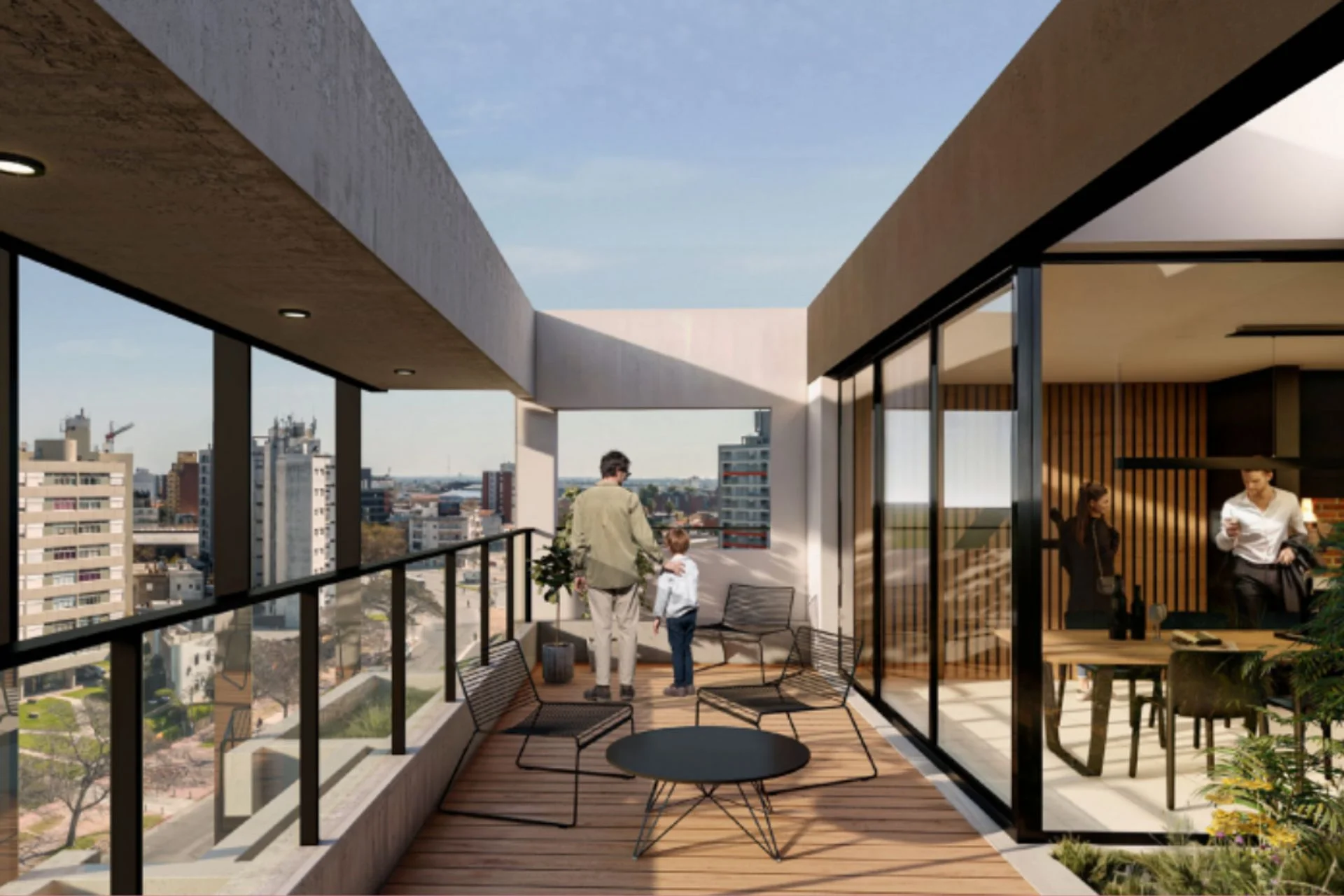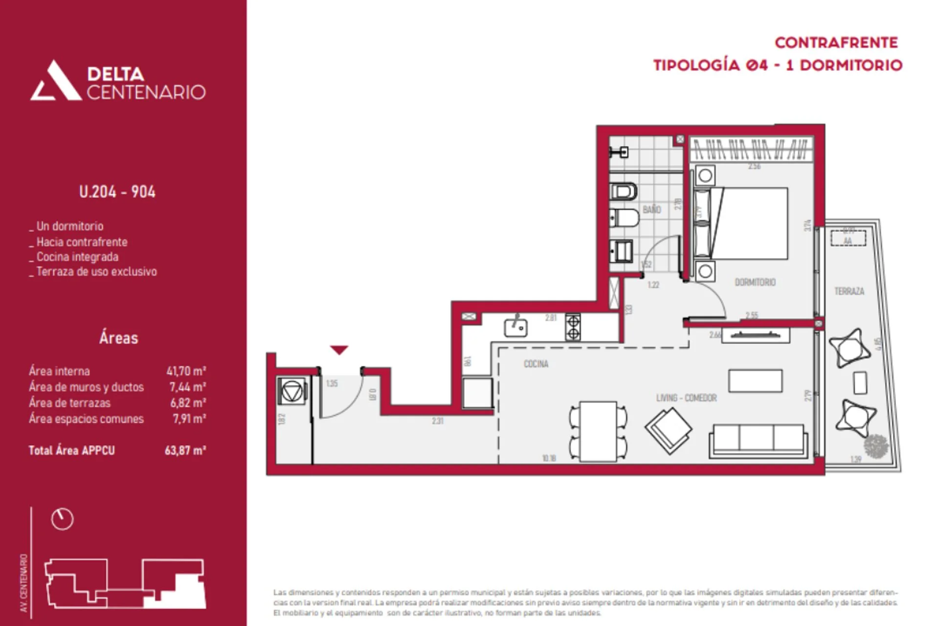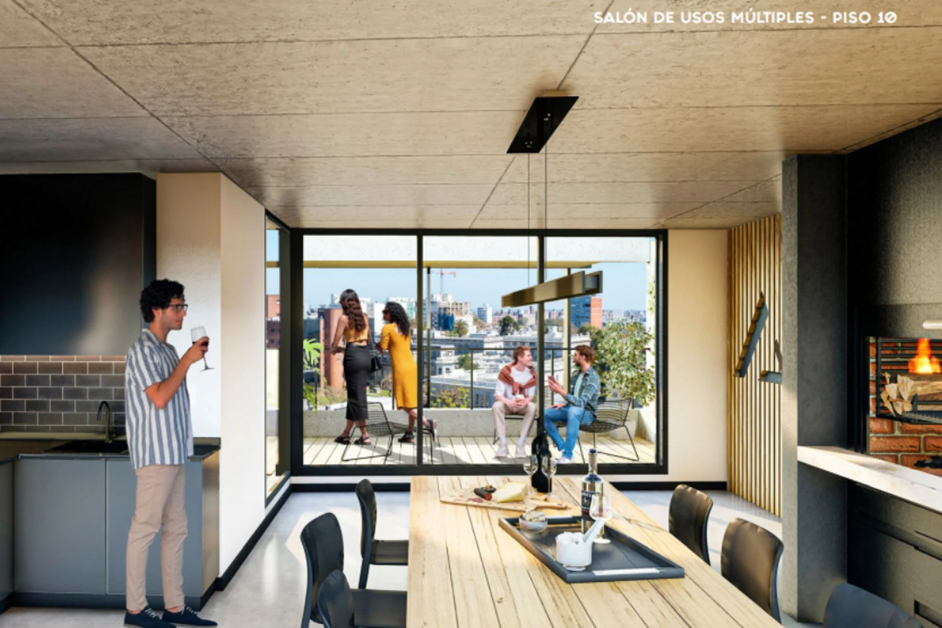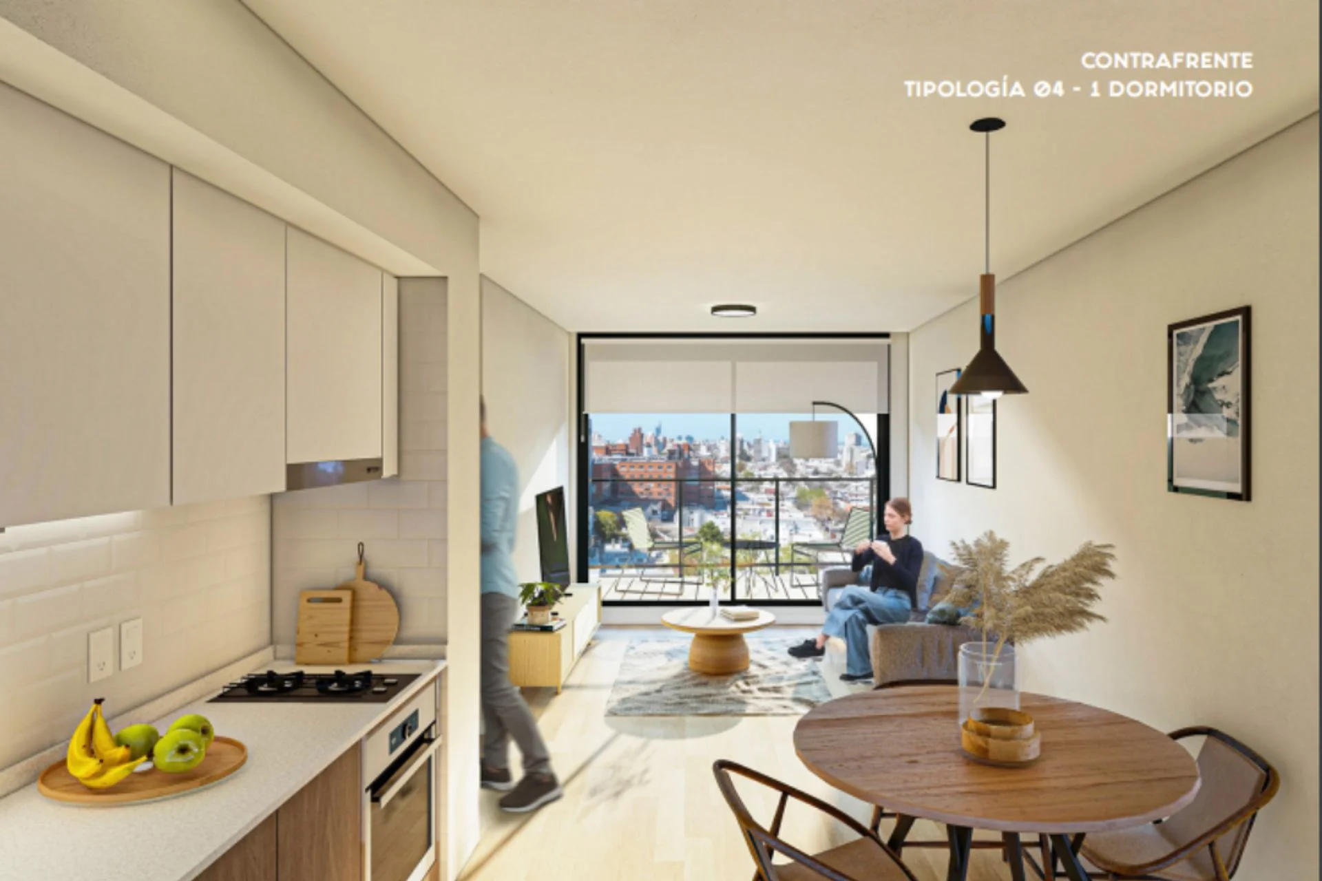Apartamento de un dormitorio de 41,70 m2 al contrafrente con orientación este y terraza de uso exclusivo de 6,82 m2. La unidad posee además, living-comedor con concina integrada provista de horno y anafe y baño completo.
