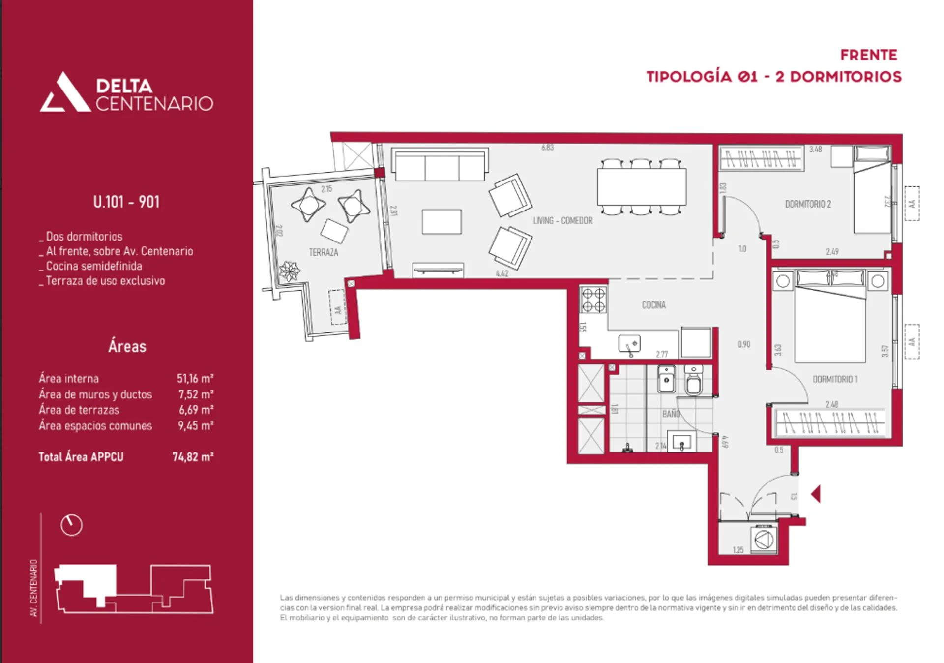 Apartamento de dos dormitorios de 51,16 m2 al frente con orientación oeste sobre Avenida Centenario y terraza de uso exclusivo de 6,69 m2. La unidad posee además, living-comedor con concina integrada provista de horno y anafe y baño completo.