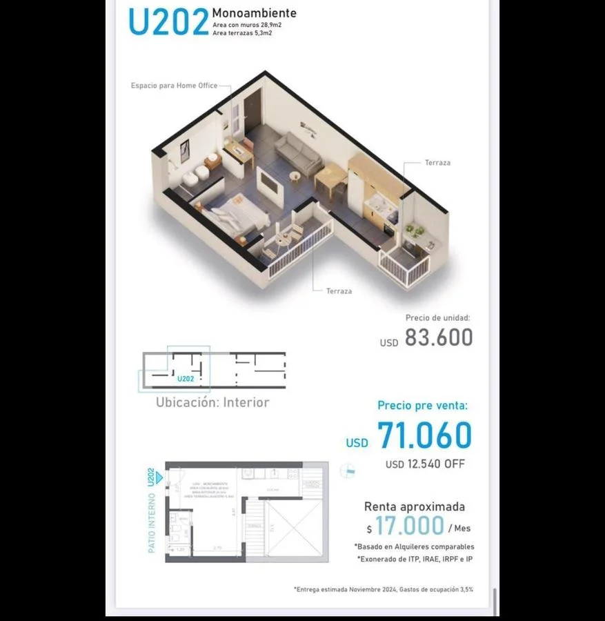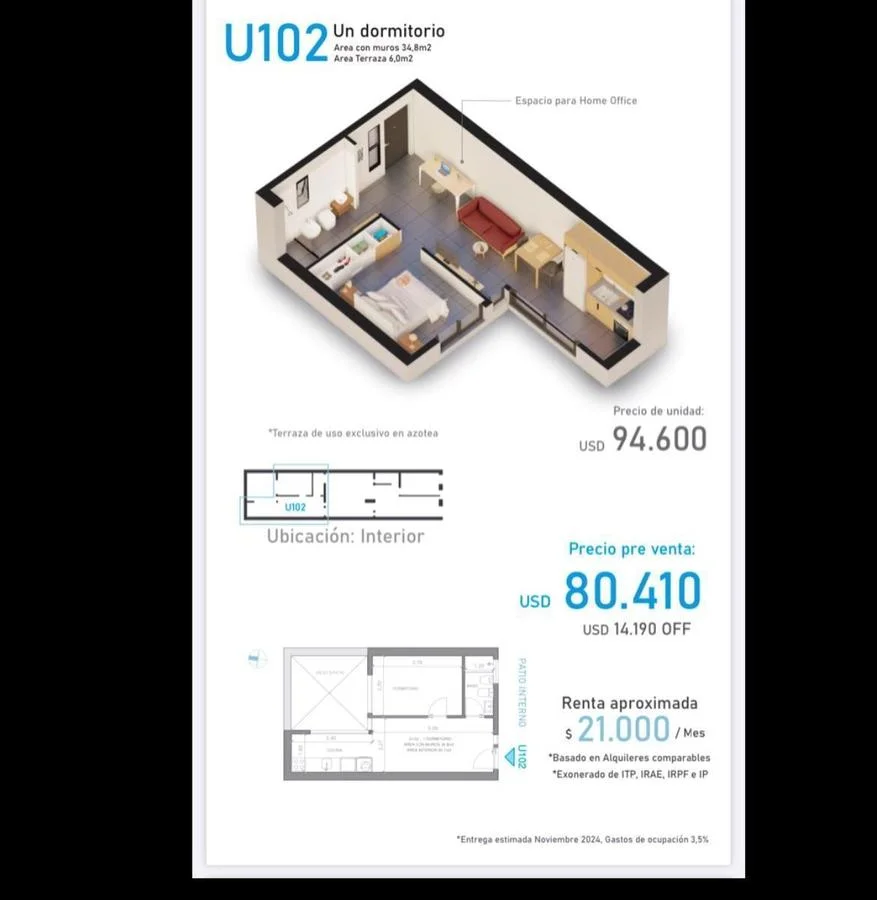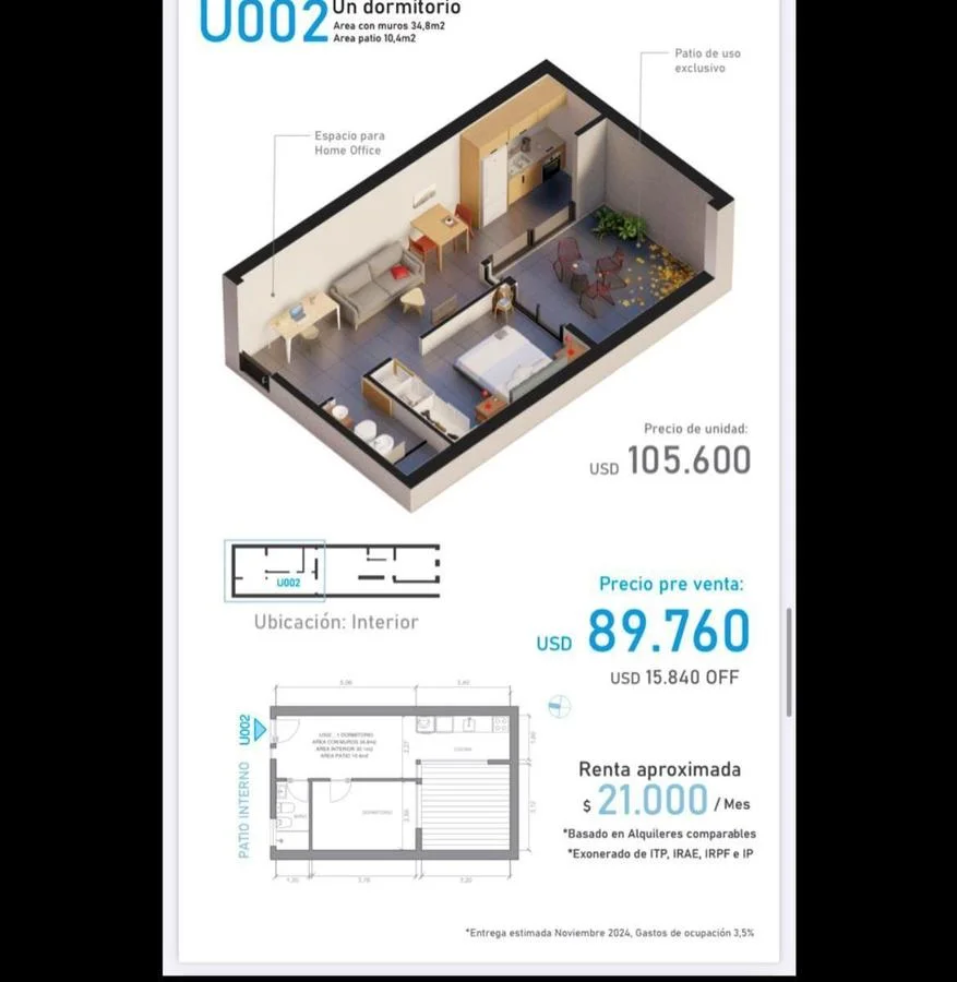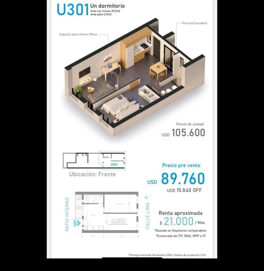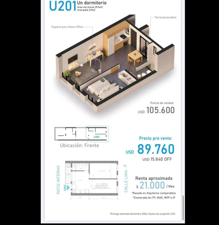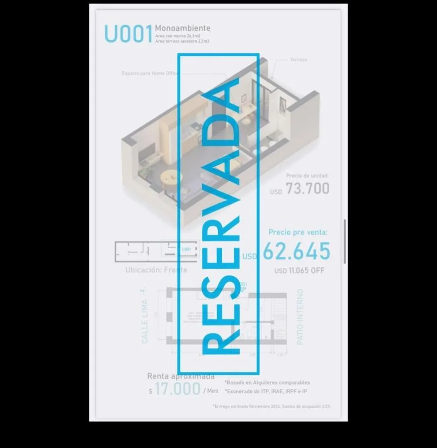 CASASWEB(205988) Oportunidad para comprar en pozo. Monoambiente. Desde U$S 71.060.NOTA: También hay disponible Apartamentos de 1 dormitorio.Excelente ubicación, en la calle Lima entre Justicia y República, cerca de todo, Tres Cruces, La Comercial, Palacio Legislativo, etc. Servicio cercanos varios: farmacia, panadería, papelería, fútbol 5, ferretería, etc.Plazo de entrega estimado: diciembre/2024Gastos de ocupación: 3,5%; en caso de pago contado se descuentan al 100%Modalidad de pago para las compras en pozo:10% de seña50% al firmar el compromiso20% a los 3 meses del pago anterior10% a los 3 meses 10% al finalizar la obra y entregar el aptoAmparado en la ley de vivienda promovida (proporciona beneficios tributarios muy importantes). Ver mas detalles en casasweb.com?205988