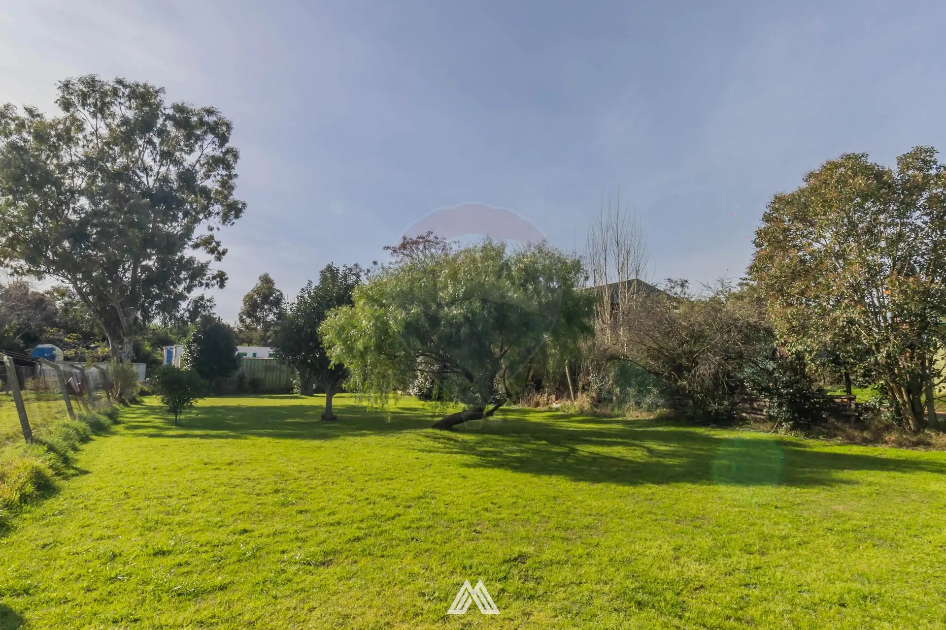 El suelo de la propiedad está parejo, con pasto corto y pocos árboles.