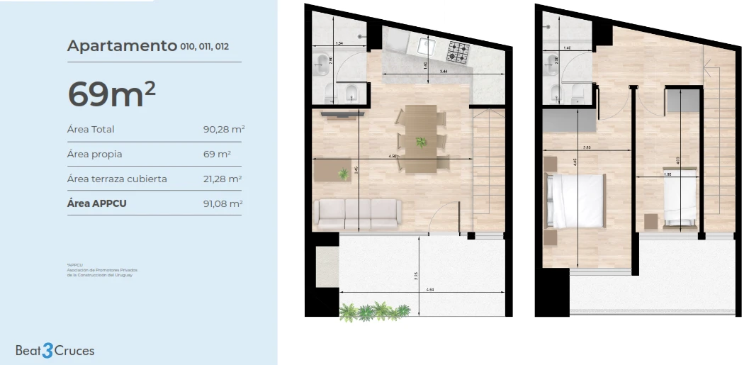 Tiene 90mts totales, 69mts apto + 21 mts de patio y terraza