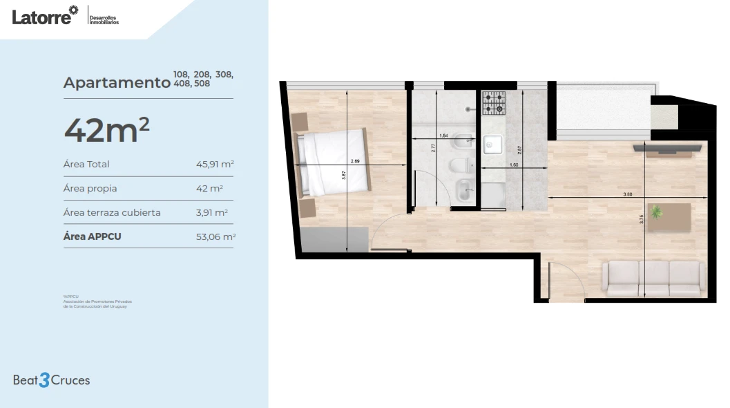 Tiene 46mts totales, 42mts apto + 4mts terrazas