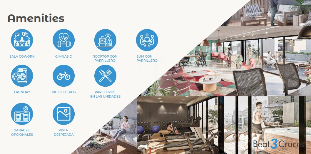 Edificio que tendrá amenities como gimnasio, espacio co work, parrilleros abiertos y cerrados, laundry, bicicleteros.