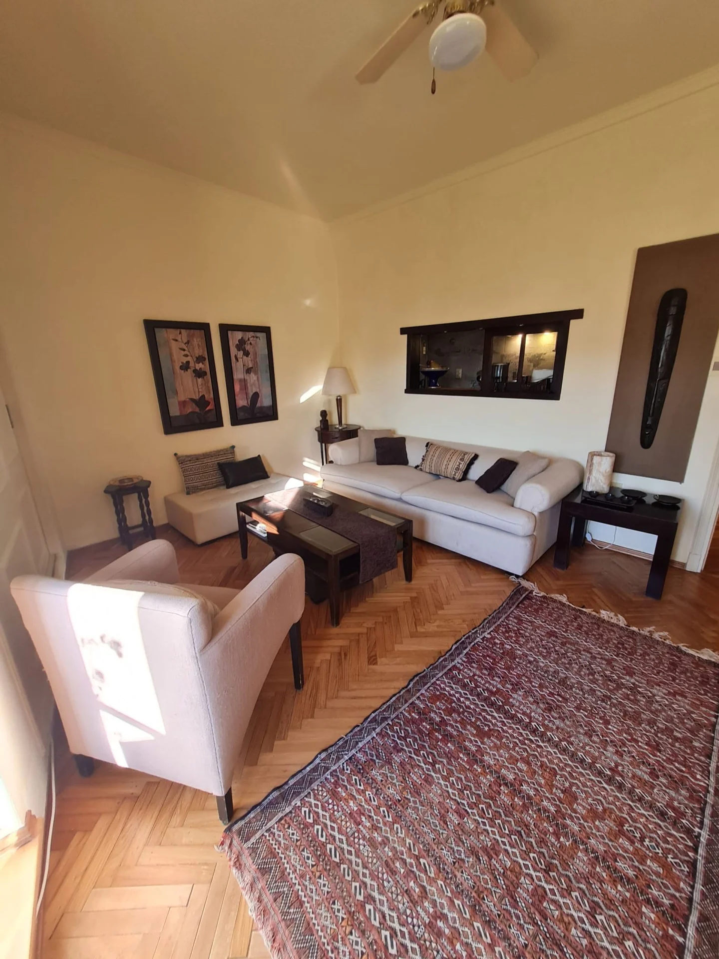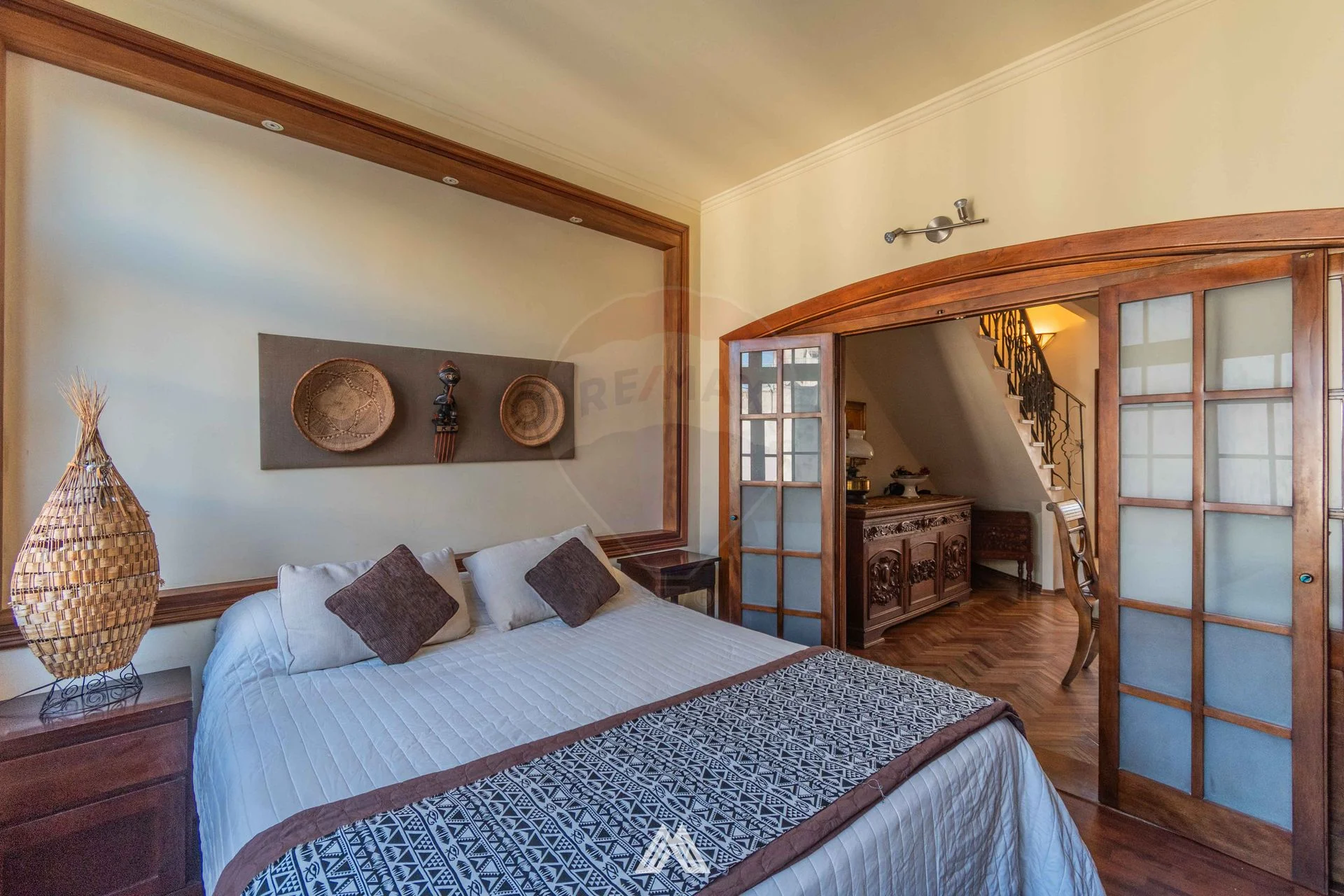 Amplio living comedor con separación de puertas de madera