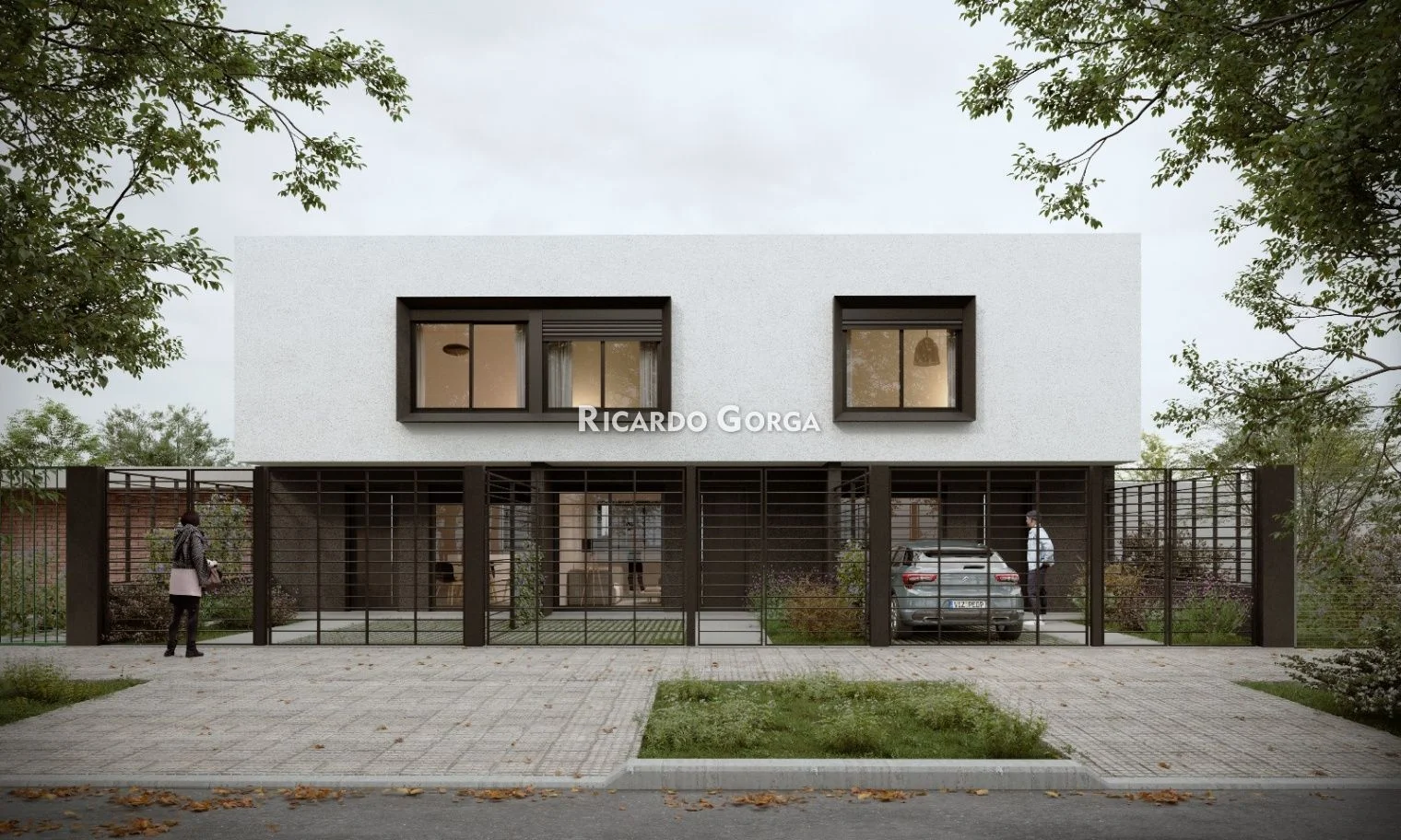 Jardín al frente con cochera y reja perimetral