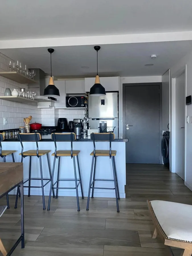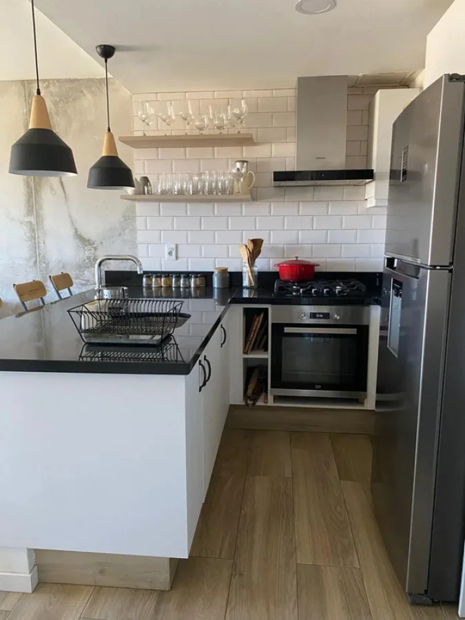 . Cocina integrada y toda equipada incluyendo barra, anafe, horno empotrado, refrigerador y campana
