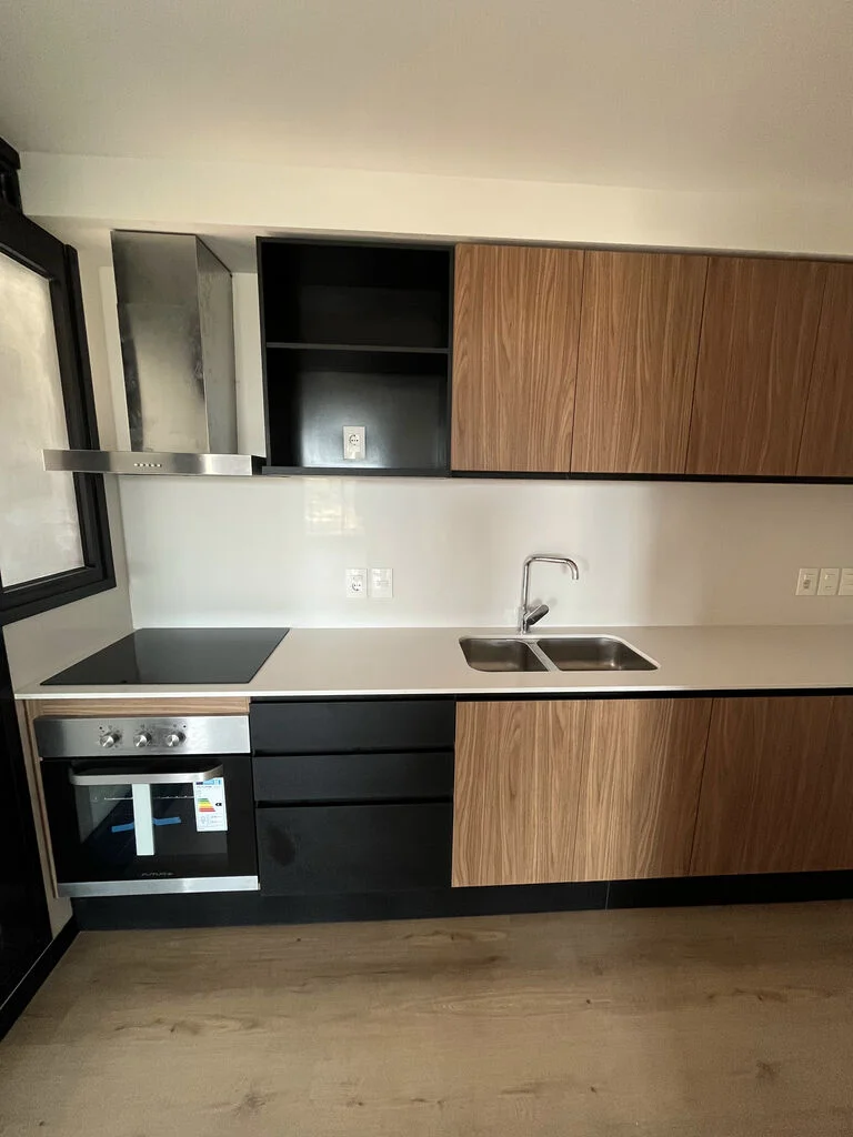 Cocina definida, con muebles bajo y sobre mesada, equipada con horno empotrado, anafe y campana extractora