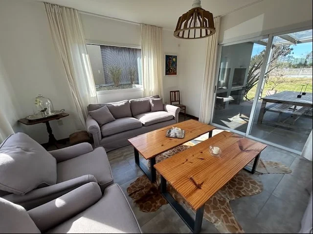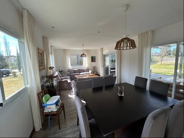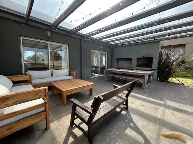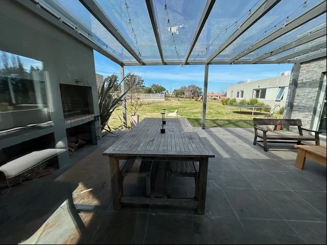 Hall de entrada, living comedor integrado al fondo, cocina al frente, toilette, gran estar con estufa a leña, 3 dormitorios con 2 baños, el principal es en suite, equipada con aire acondicionado split para calefacción. Lindisima pérgola techada con parrillero y una piscina climatizada para disfrutar en los días cálidos, amplio fondo con divina vista despejada a las canchas de golf.