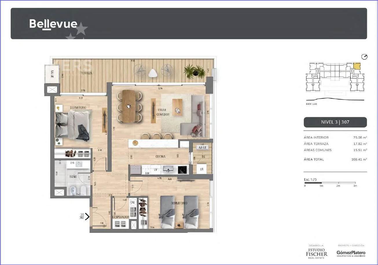 Living comedor con terraza, despojador, cocina semi integrada con barra y placares, 2 dormitorios, 1 con terraza, 1 baño. Lavadero. Preinstalación para aire acondicionado.