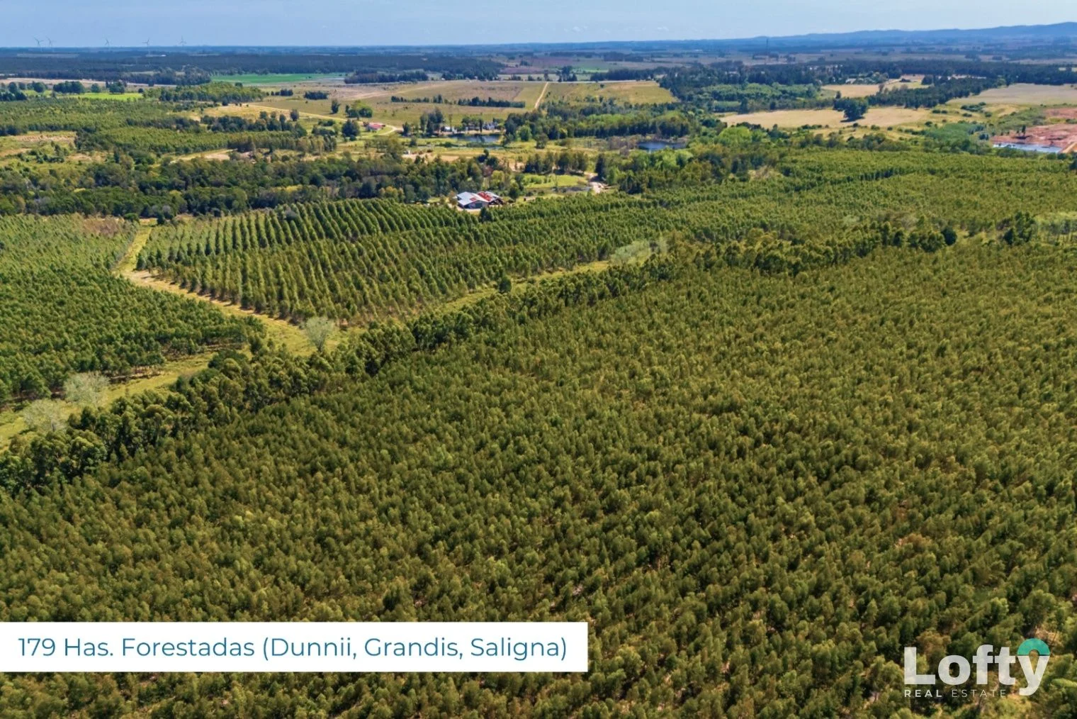 El predio cuenta con 179 hectáreas forestadas, debidamente declaradas ante el Ministerio de Ganadería, Agricultura y Pesca (MGAP), con la siguiente composición de especies: