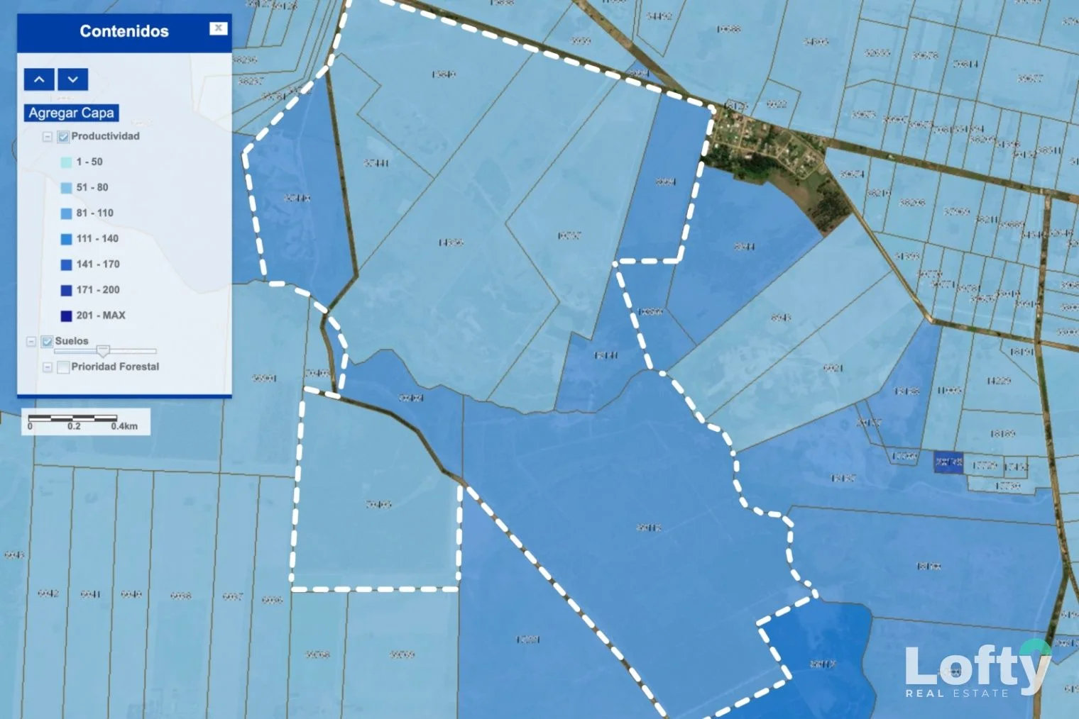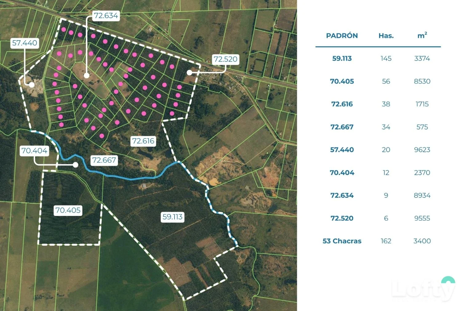 El predio cuenta con un fraccionamiento de 53 chacras de 3 hectáreas cada una, lo que habilita dos líneas de negocio posibles: la comercialización individual de las unidades ya creadas, o el desarrollo integral de un barrio cerrado de chacras, con potencial de ampliación del proyecto hacia la costa del arroyo Tío Diego.