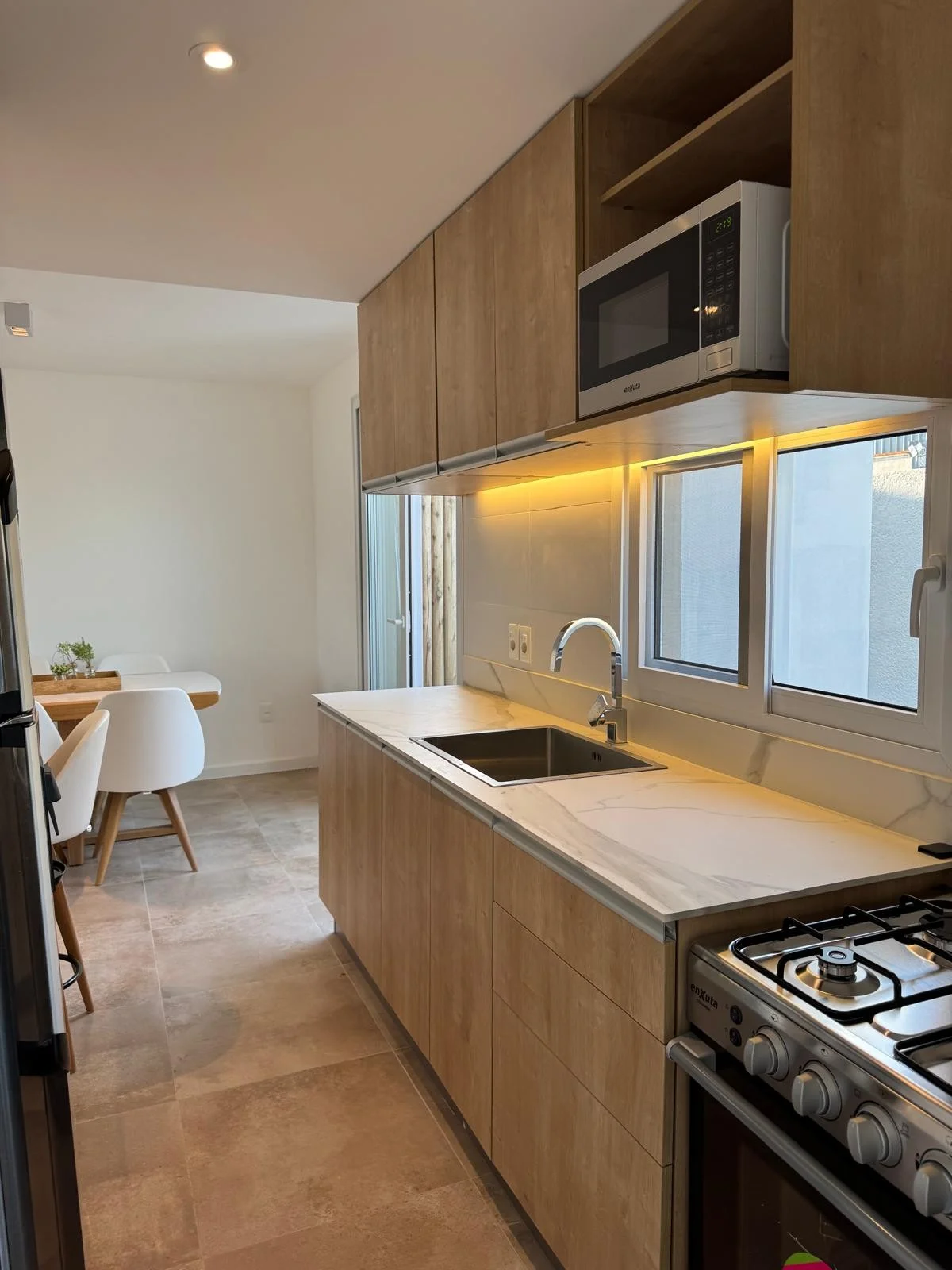Hermosa casa a estrenar de 2 dormitorios, con excelente diseño y terminaciones de alta calidad. Ubicada en un barrio jardín de 1.400 m² en San José de Carrasco, esta propiedad se encuentra en una zona estratégica, a 600 metros del aeropuerto y a 300 metros de la Ruta Interbalnearia, con excelente conexión hacia los principales puntos de la ciudad. Además, está a 200 metros de Almenara Mall y a solo 5 minutos de Costa Urbana Shopping, con acceso a todos los servicios. La propiedad cuenta con 75 m² interiores y 150 m² de áreas exteriores, distribuidos en dos plantas. En planta baja dispone de un amplio living-comedor, cocina integrada con barra y un baño completo. En planta alta se encuentran dos dormitorios con placares y otro baño completo. La casa cuenta además con jardín propio con parrillero y cochera para un auto, ideal para disfrutar del aire libre. Amenities del complejo piscina solárium salón de usos múltiples laundry pet corner El barrio cuenta con seguridad 24 horas y garita de vigilancia en el acceso principal. Gastos comunes: $ 6.000 aprox. Comunícate con nosotros para coordinar una visita o recibir más información.