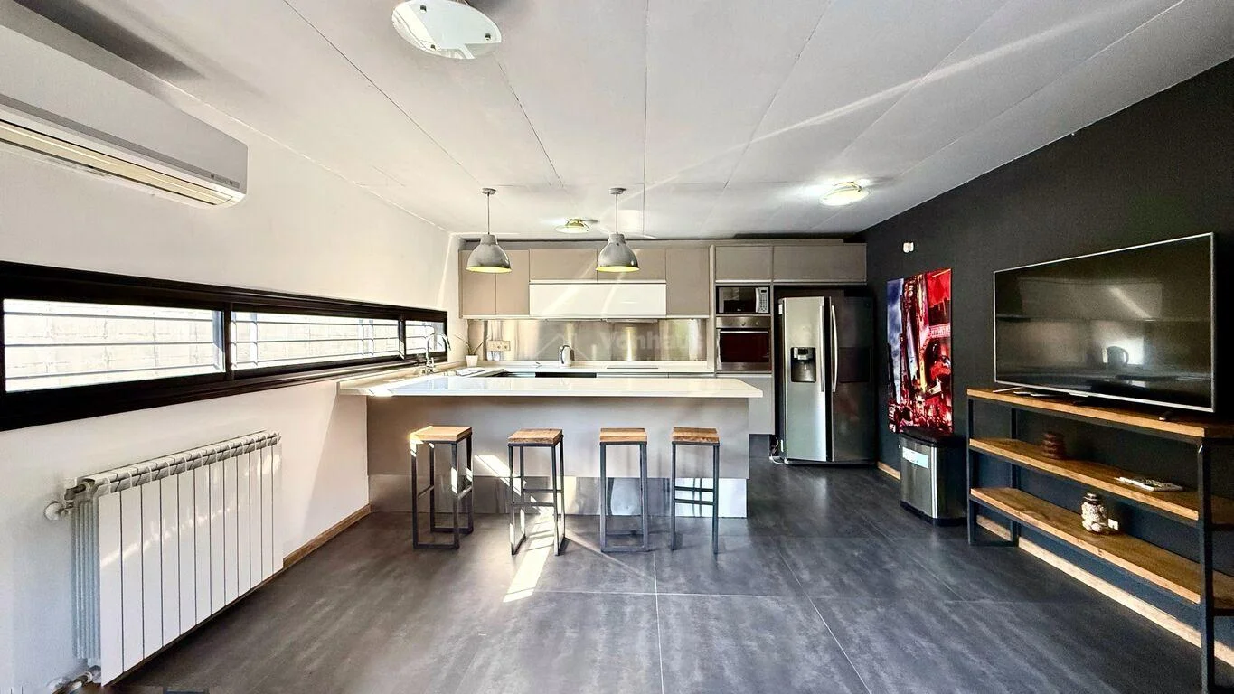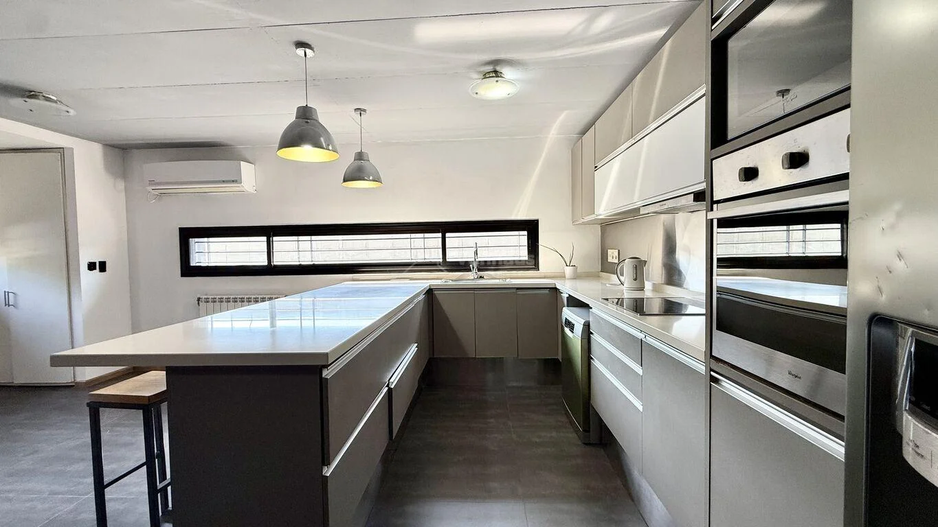 La cocina, equipada con horno, anafe y campana, esta integrada al estar con comedor diario y salida directa al jardín.