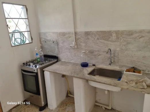 El apartamento al fondo cuenta con dos dormitorios, baño, y cocina integrada al comedor.