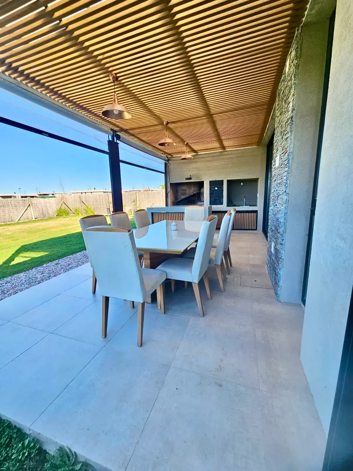 En VENTA - Casa en Barrio Privado La Juana. Casa toda en una planta, ubicada en el exclusivo barrio privado La Juana, en una amplia esquina. Ideal para quienes buscan calidad de vida en un entorno en expansión. La propiedad se desarrolla en un terreno de 1077 m² con 152 m² construidos. Actualmente cuenta con 2 dormitorios, ya que el principal fue ampliado uniendo dos habitaciones, pero puede volver a dividirse fácilmente mediante un tabique de yeso. Se mantienen las dos puertas, instalaciones eléctricas y estructuras necesarias. Amplio fondo con piscina climatizada con clorador de sal, barbacoa techada con parrillero, anafe y horno de leña. Cuenta además con losa radiante en toda la casa, agua caliente central por bomba de calor, paneles solares en la azotea, tender, sala de máquinas, huerta orgánica, cargador para autos eléctricos y orientación norte. La vivienda tiene control domótico de todos los servicios, incluyendo riego automático conectado por WiFi. El barrio privado cuenta con bajos gastos comunes e incluye seguridad y portería 24/7, videovigilancia, mantenimiento de áreas verdes, conexión a agua potable de planta de ósmosis inversa, IntelliMarket y plaza para niños. Está previsto además el desarrollo de club house, piscina cerrada y climatizada, guardería, gimnasio, cancha multi sport, juegos infantiles y sendero de running. La comisión inmobiliaria es del 3% más IVA.