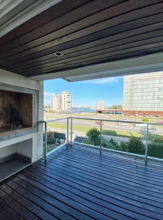 El apartamento dispone de un amplio living comedor con estufa leña y aire acondicionado, vista al frente a Av. de las Américas, gran terraza con parrillero. Cocina lavadero con desayunado, muebles aéreos y bajo mesada, terraza lavadero